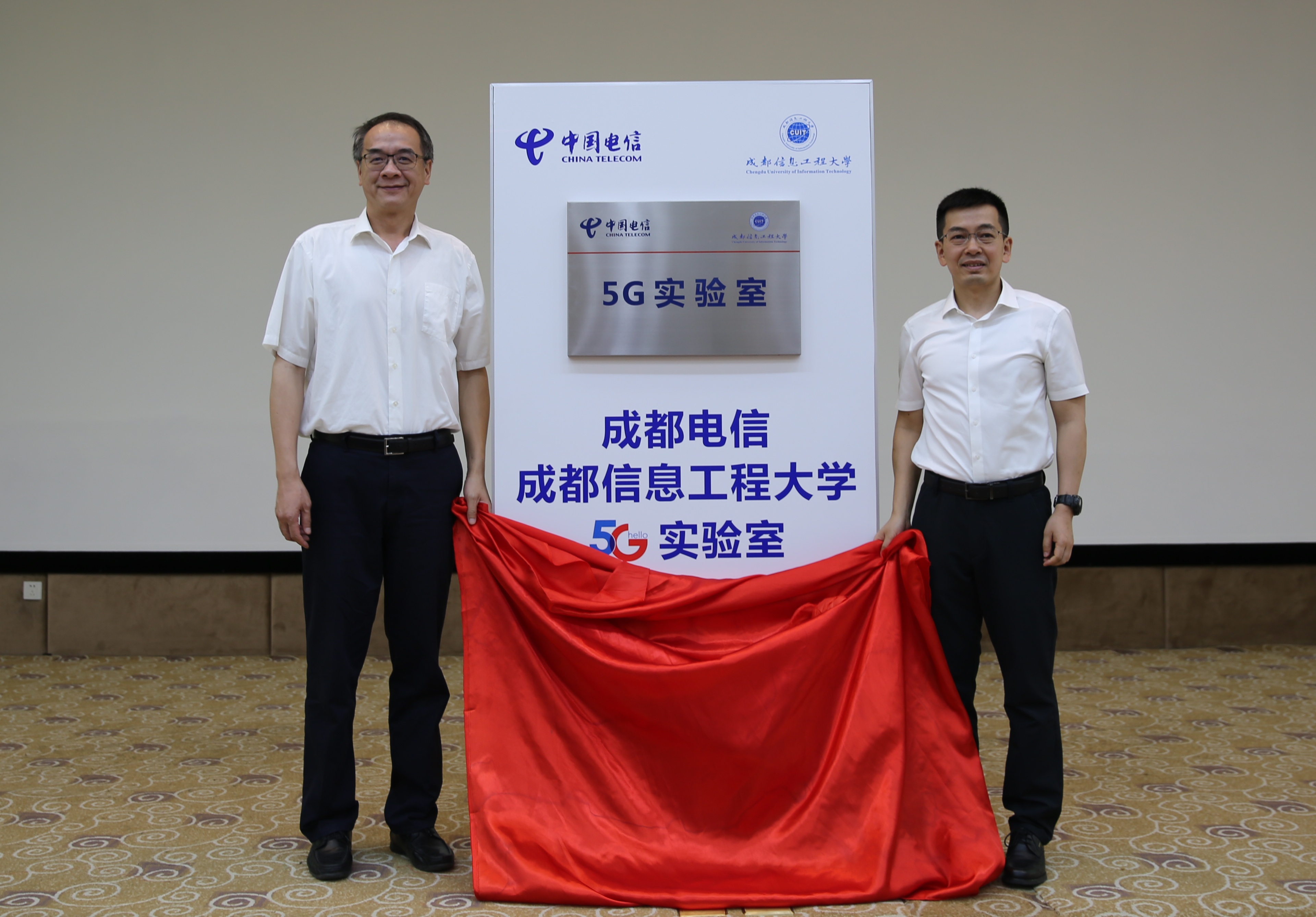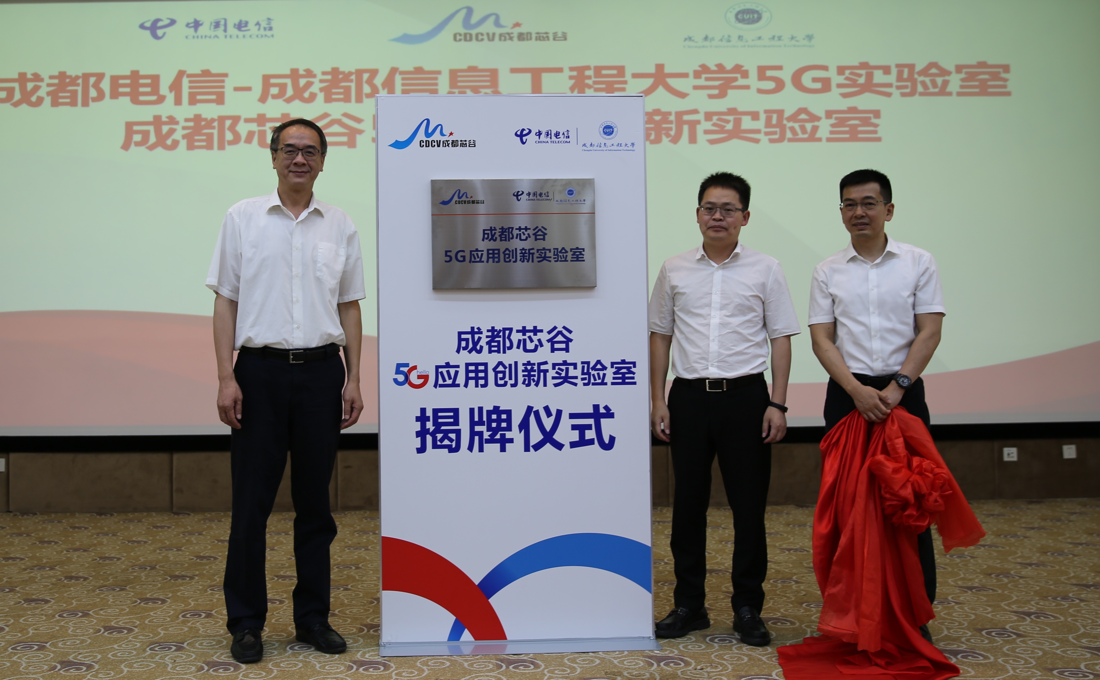 余敏明、杨洋为“成都电信-成都信息工程大学5G实验室”揭牌。韩超、余敏明、杨洋为“成都芯谷5G应用创新实验室”揭牌。