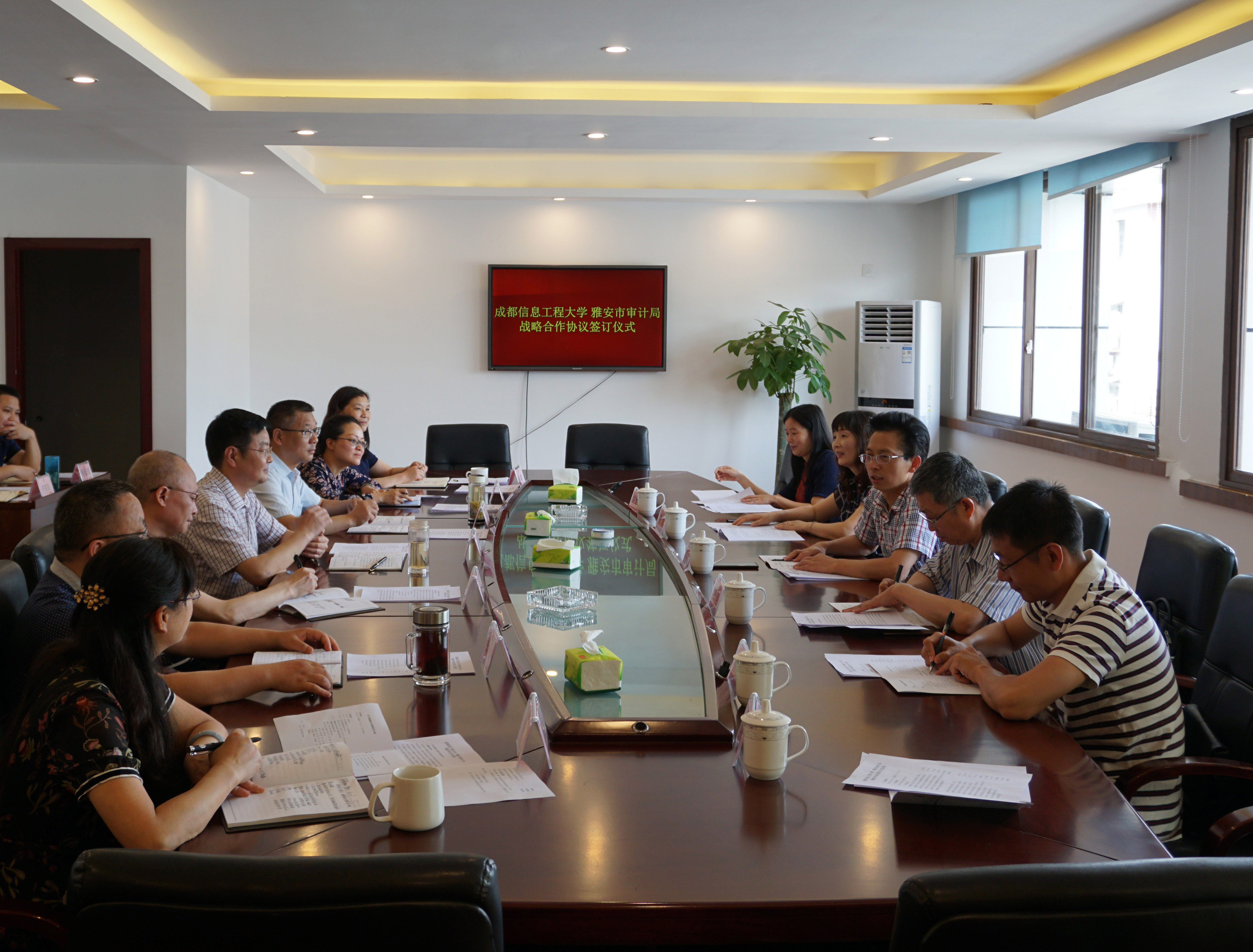 【本网讯】为深入贯彻习近平总书记关于审计工作的重要论述和重要指示精神及习近平总书记对四川工作系列重要指示精神,解读党的十九届四中全会精神。强化综合审计大数据管理平台建设,推进审计事业健康有序发展。6月4日,学校与雅安市审计局在雅安市签署战略合作协议。雅安市审计局局长曹刚,副局长郑文翔、陈浮、李春,总审计师张晓东,机关党委书记杨霞,学校副校长肖月强以及计算机学院、软件工程学院、管理学院、继续教育学院相关人员参加了签约仪式。会议由曹刚主持。