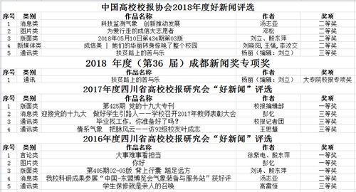 【本网讯】近日,校报好新闻评选结果陆续揭晓,我校《成都信息工程大学报》参评的作品获得多个奖项。其中,5项作品获得中国高校校报协会2018年度好新闻奖(二等奖4项、三等奖1项),1项作品获得2018年度(第36届)成都新闻奖专项奖,4项作品获得2017年度四川省高校校报研究会“好新闻”(一等奖1项、三等奖3项),5项作品获得2016年度四川省高校校报研究会“好新闻”(一等奖3项、二等奖1项、三等奖1项)。