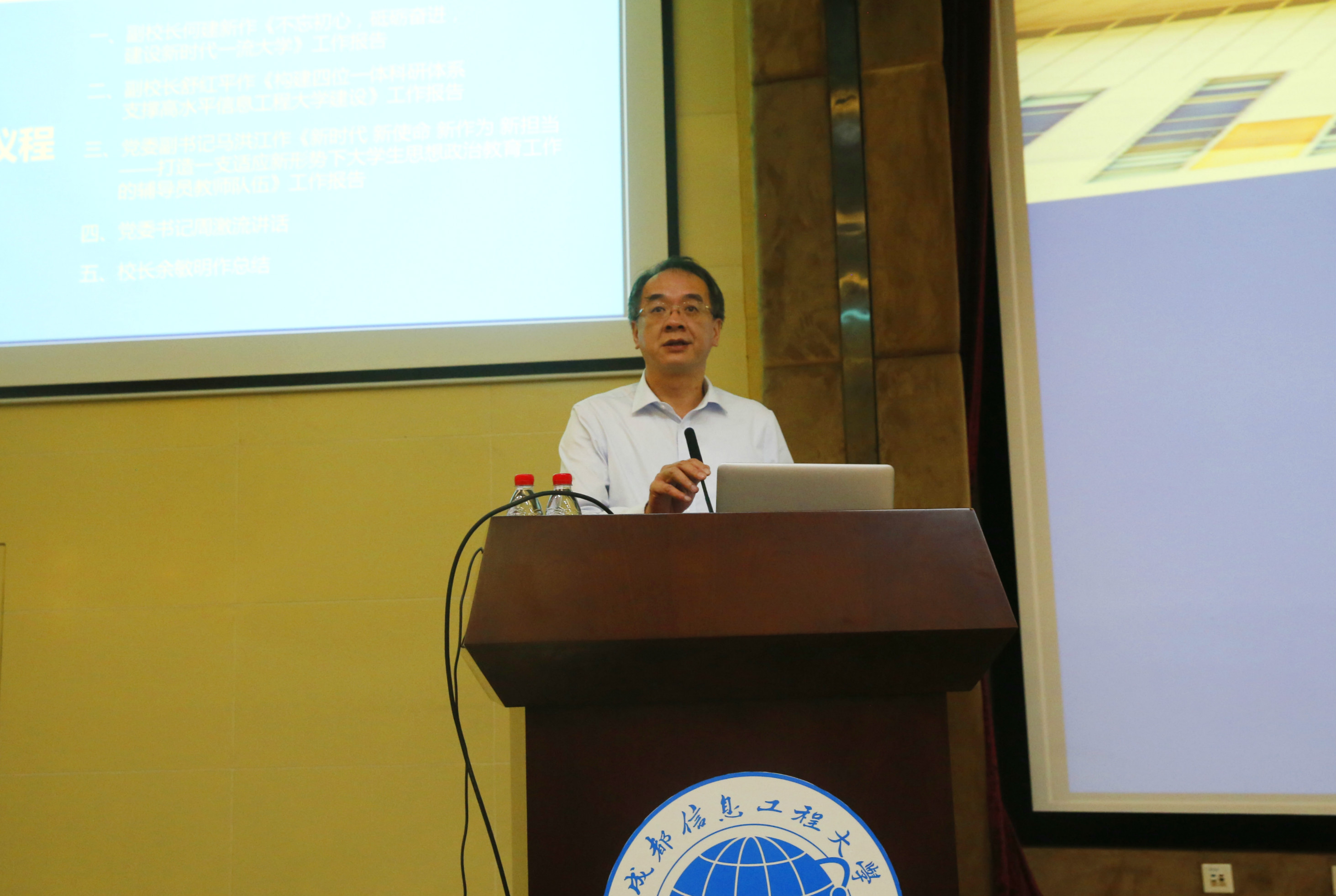 副校长何建新作了《不忘初心 砥砺奋进 建设新时代一流大学》的工作报告。何建新从“开放的特色鲜明的高水平信息工程大学”的目标及内涵分析入手,结合实例和统计数据,从开放合作交流、鲜明办学特色、高水平人才培养三个维度系统回顾了学校在学科、专业、课程建设方面取得的成就,深入分析了存在的不足,提出了以新时代“一流学科、一流专业、一流课程”建设为指引,以“一流学院”建设为基础,加强博士点建设,做好专业建设规划,强化质量保障体系运行,夯实培养基础的“一流大学”建设思路和措施。