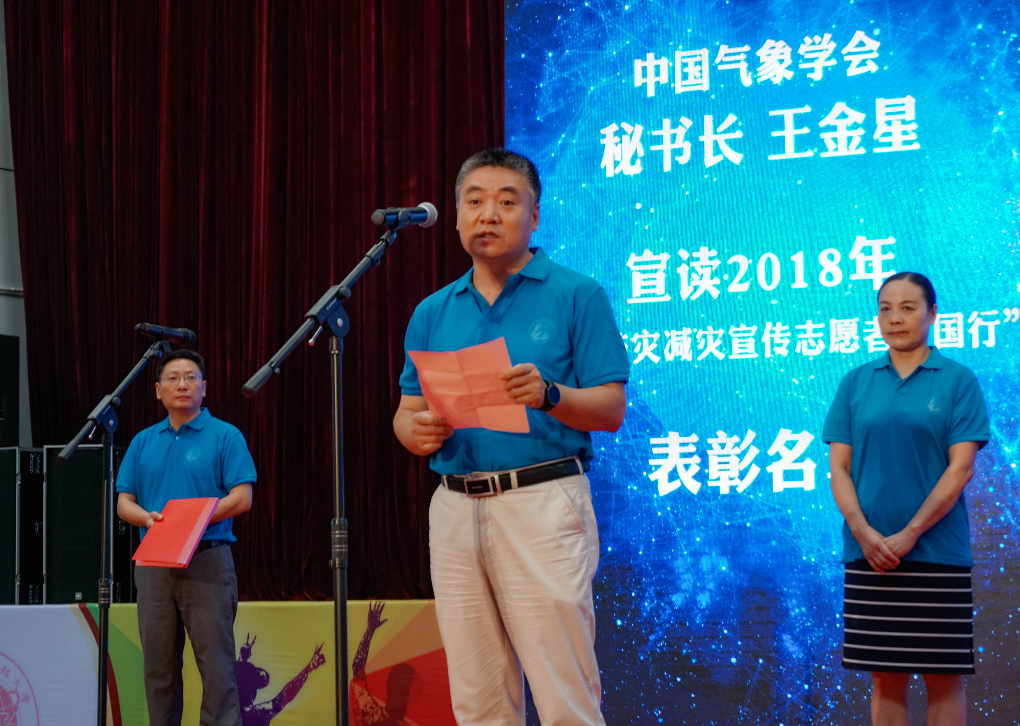 王金星宣读了2018年“气象防灾减灾宣传志愿者中国行”活动评优表彰名单。成都信息工程大学—成都A队、东北农业大学—中国气象行团队、四川农业大学—将计就计团队、兰州大学—中国气象防灾减灾科普宣传队重庆分队等分别获得2018年“气象防灾减灾宣传志愿者中国行”活动最佳报告奖、最佳文字记录奖、最佳影像记录奖、最佳创意奖和一二三等奖团队等奖项。成都信息工程大学、南京信息工程大学、兰州大学、东北农业大学、四川农业大学获得优秀组织单位荣誉。参会领导为获奖团队和优秀组织单位颁奖。