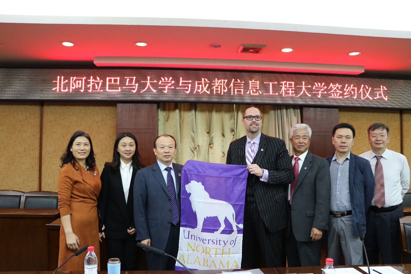 【本网讯】4月10日上午,成都信息工程大学(CUIT)与北阿拉巴马大学(UNA)“121本科人才培养合作框架协议”签约仪式在学校行政楼第七会议室举行。北阿拉巴马大学教务长/副校长代表罗丝·亚历山大、国际事务资深副校长张春生、中教国际教育交流中心《中美人才培养计划》121项目办副总监刘法群,我校副校长何建新,国际交流与合作处、资源环境学院负责人参加了签约仪式。签约仪式由国际交流与合作处处长何嘉主持。