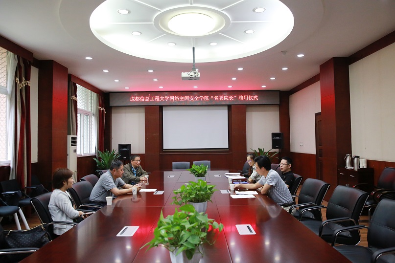 肖月强为郑建华院士颁发了网络空间安全学院名誉院长聘书,并签订了网络空间安全学院名誉院长聘用协议。他向郑建华院士简要介绍了学校近年来学科建设,特别是网络空间安全学科发展的情况。他表示,郑建华院士成为学校网络空间安全学院名誉院长,将对学校网络空间安全学科建设和博士点建设起到积极的推动作用。