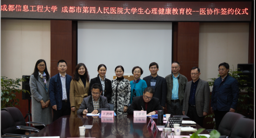 在与会嘉宾的共同见证下,于世祥与王洪明共同签署了《成都信息工程大学与成都市第四人民医院关于建立大学生心理健康教育校医联系机制的协议书》以及《成都信息工程大学患病学生出入院快速通道协议书》。
