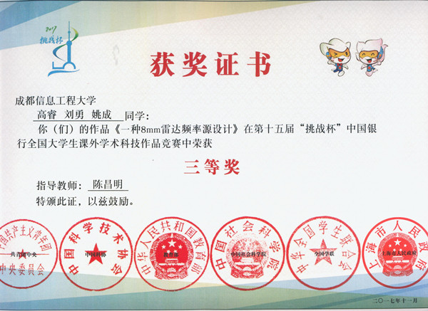 【本网讯】11月14日至19日,由共青团中央、中国科协、教育部、中国社会科学院、全国学联和上海市政府主办,上海大学承办的第十五届“挑战杯”全国大学生课外学术科技作品竞赛终审决赛在上海大学宝山校区举行。我校由通信工程学院陈昌明教授指导,高睿团队的作品《一种8mm雷达频率源设计》项目获得全国三等奖。