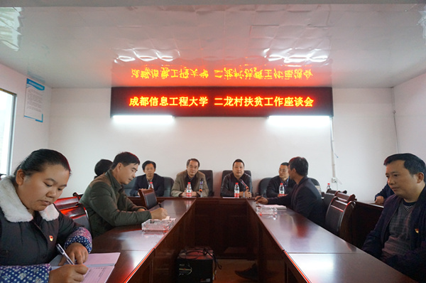 余敏明一行先后走访了二龙村小学、农房改造、旅游示范点,开展了贫困户入户慰问,代表学校为二龙村授“成都信息工程大学实践教学基地”牌匾,捐赠20多套党建工作学习材料,并就扶贫政策、资金、项目落实及存在问题与村两委开展了深入座谈。他欢迎乡村各级干部前来我校进行社会实践授课,帮助师生正确分析实践活动中发现的问题,用乡村的发展理念启发学生探索、鉴别、思考、研究和发展,提高学生实践能力。他希望二龙村充分用好各项扶贫政策,灵活发挥扶贫资金效能,持续保障资金精准滴灌。争取成为产业发展试点地区,稳定增加村集体经济收入,带动贫困户走上自主脱贫致富的可持续发展道路。他表示,学校将发挥智库优势,充分调动资源,做好项目调研,协调二龙村与上级扶贫主管部门沟通,解决具体问题。