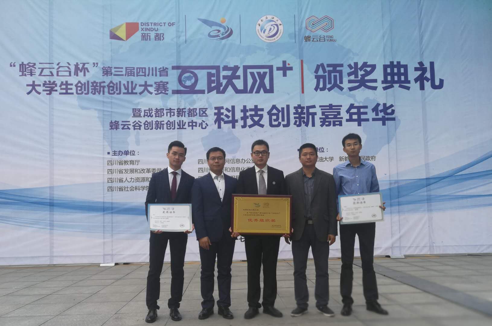 【本网讯】10月13日上午,第三届四川省“互联网+”大学生创新创业大赛颁奖典礼在新都区蜂云谷创新创业中心隆重举行。学校副校长于世祥,教务处、校团委相关负责人及获奖师生代表参加了颁奖典礼。由于在大赛组织工作中表现突出,我校被授予第三届四川省“互联网+”大学生创新创业大赛“优秀组织奖”,蒋涛、樊昌元、王钊仙、厉威成四位老师被评为优秀指导教师。
