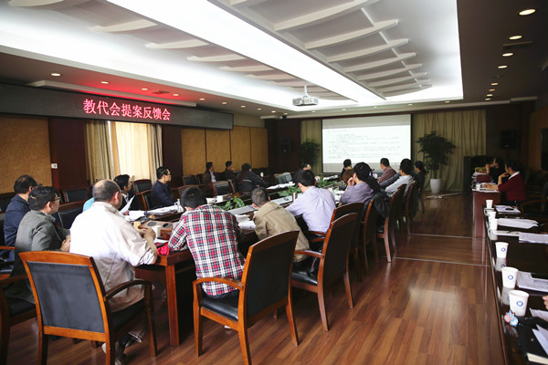 【本网讯】4月18日,学校教代会提案反馈会议在行政楼第七会议室召开。党委副书记倪鸣,副校长于世祥、何建新,相关职能部门负责人,教代会执行委员会和教代会代表们以及提案人参加了会议。会议由学校教代会提案委员会主任羊裔高主持。