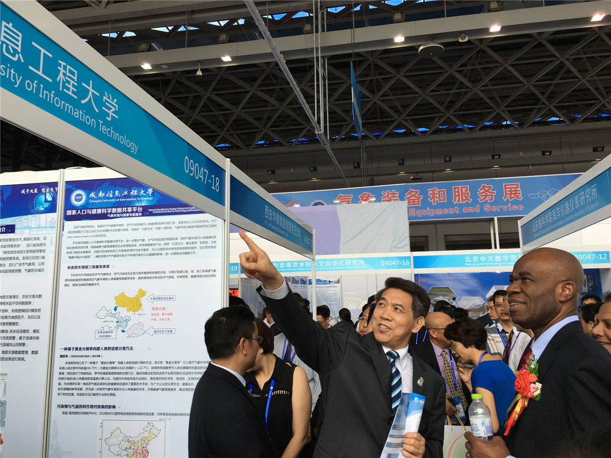 开幕式后,郑国光与东盟国家及国际组织的代表一同参观了展览,郑国光在参观我校展区时听取了我校党委副书记敬枫蓉的汇报。在汇报时敬枫蓉指出,成都信息工程大学长期从事气象装备研发与气象服务产品开发,此次参展项目均是我校教师依托科研项目形成的科研成果转化,科研成果只有产品化才能真正形成了生产力,此次参展,既是我校科研成果的汇报与展示,也更希望通过展会与更多的单位开展合作,共同为中国、东盟国际乃至全球的气象事业发展贡献成信人的力量。参观后,郑国光还饶有兴趣的亲自用英语向WMO发展和区域活动司司长Yinka Adebayo介绍我校的前身“成都气象学院”。