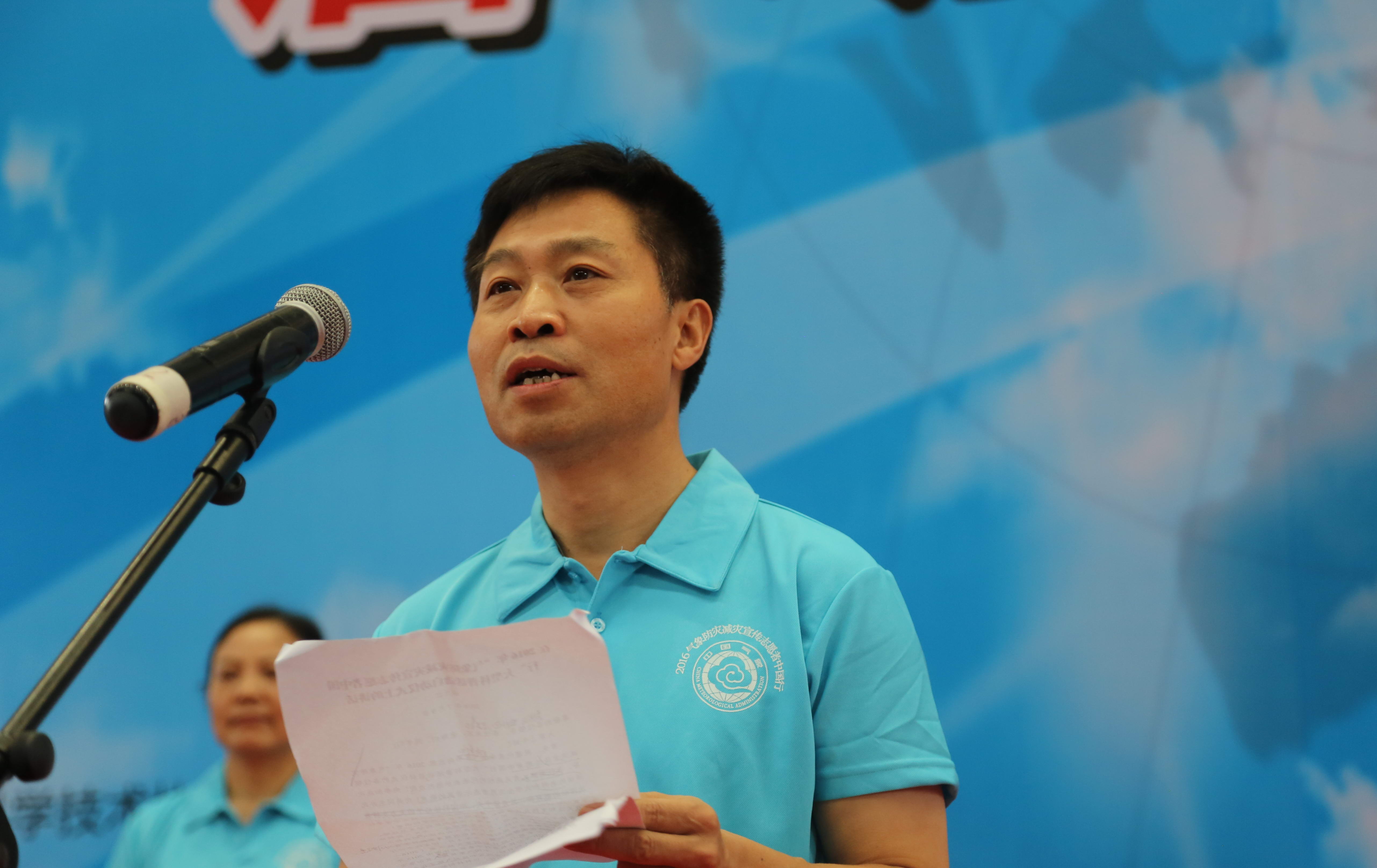 洪兰江宣布“气象防灾减灾宣传志愿者中国行”活动正式启动。启动仪式现场,与会领导向各省志愿者代表授旗,我校大气探测学院学生刘远志代表志愿者领誓。