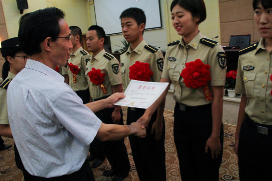赖廷谦宣读《关于表彰2016年度火箭军优秀毕业国防生的通报》和《关于表彰2016届优秀毕业国防生的决定》。赖廷谦、周激流、王主任为14名综合素质突出、志存高远、勇于担当的“优秀毕业国防生”颁发了荣誉证书并合影留念。
