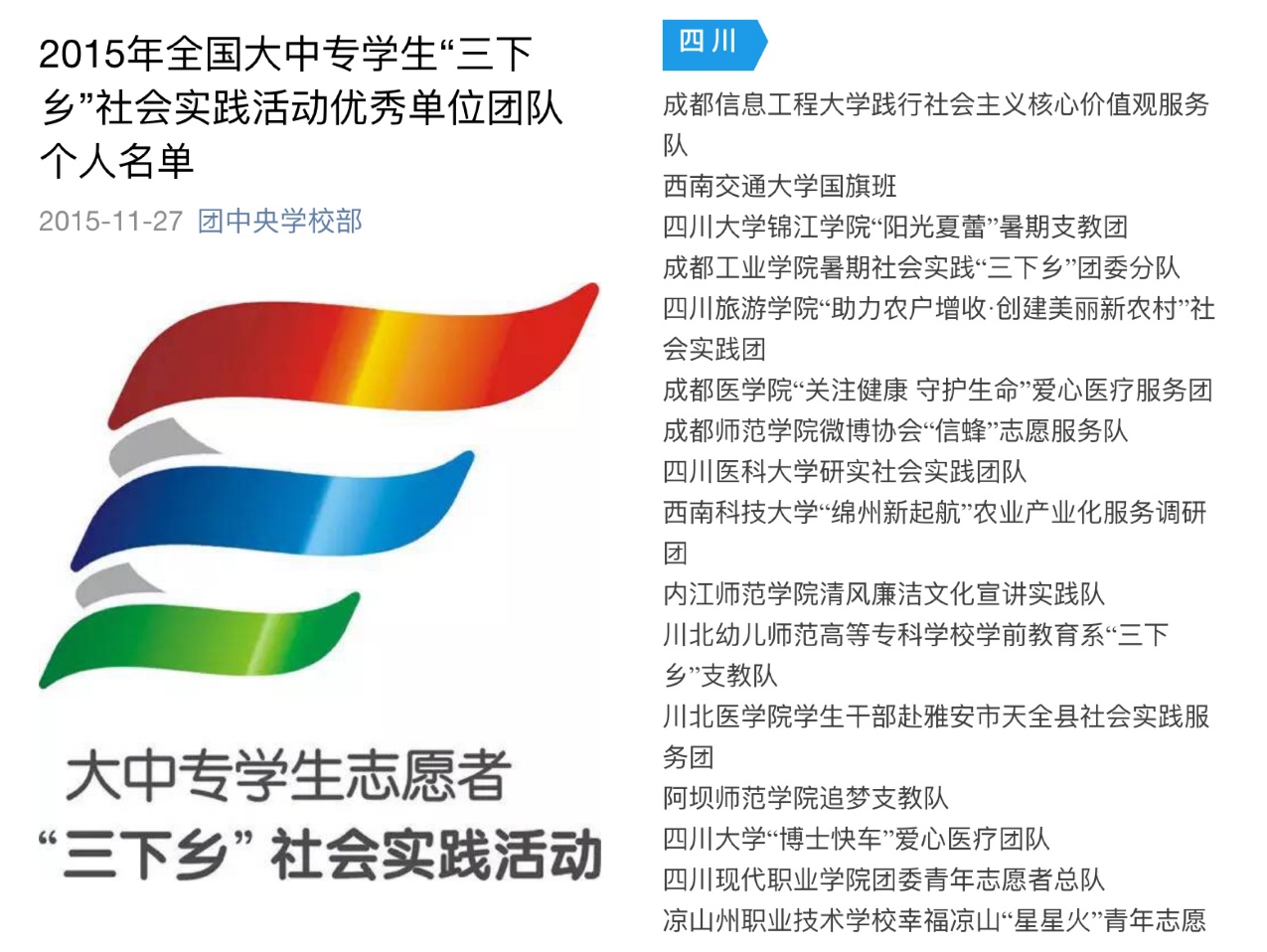 【本网讯】近日,从团中央学校部微信平台获悉,2015年全国大中专学生“三下乡”社会实践评选活动结果揭晓,我校“成都信息工程大学践行社会主义核心价值观服务队”以四川省排名第一的成绩荣获2015年全国大中专学生“三下乡”社会实践优秀团队荣誉称号,成为全国400支获此殊荣的团队之一。