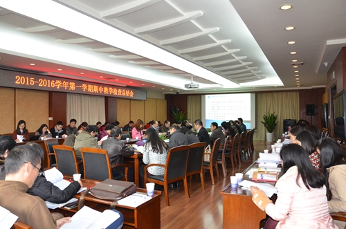 教务处从常规教学、试卷质量及规范、过程化考核、毕业设计(论文)、实验教学、审核评估进展情况等6个方面,总结了本次期中教学检查取得的成效和存在的问题,并提出了整改意见。学校教学督导组王保志教授从督导听课、教学投诉、学生座谈、期中教学检查、新进教师实训等5方面做了督导工作报告,强调了教师提高教学能力和课堂管理的重要性。吴四九对《2014-2015学年第二学期课程教学状态分析报告》和《2014-2015学年第二学期学情调查数据报告》进行了数据解读。