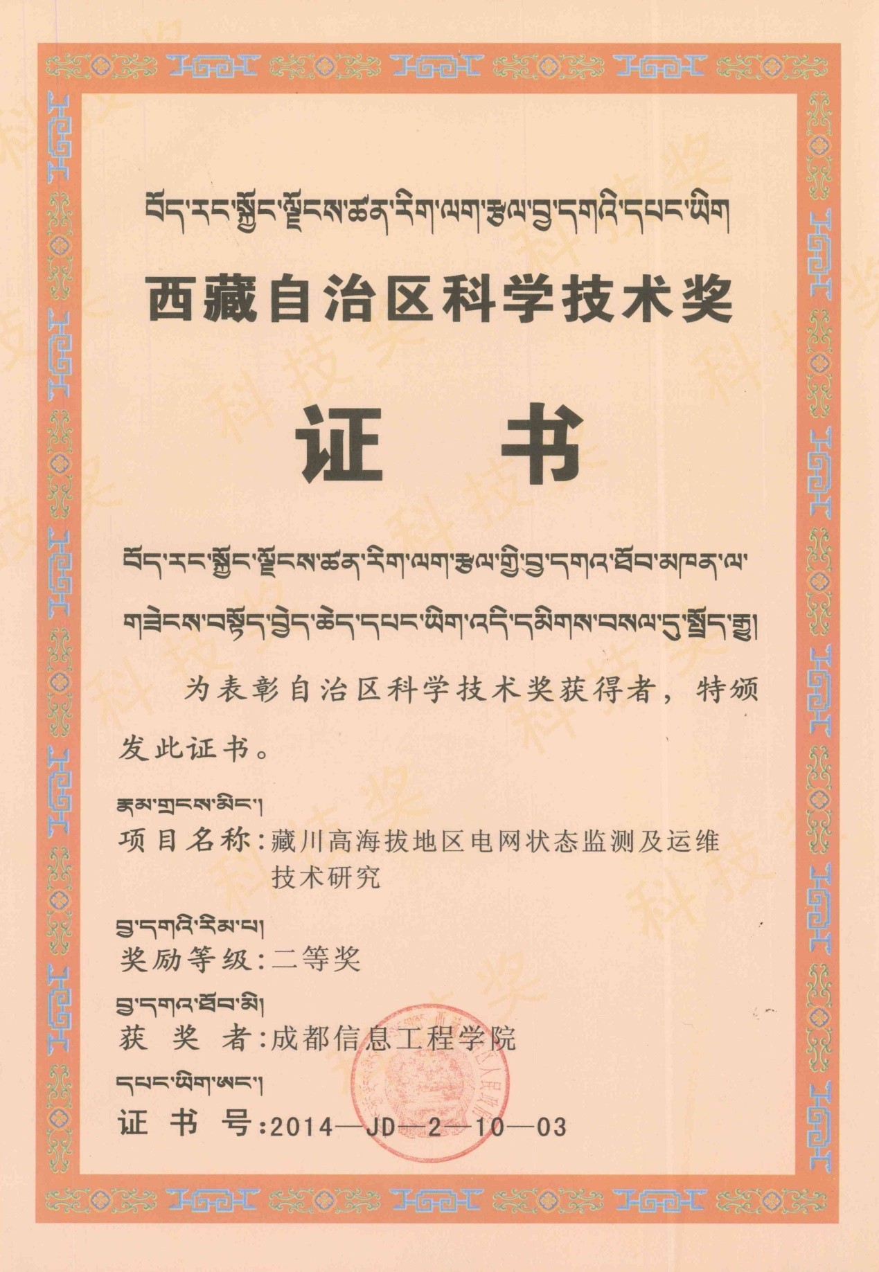 【本网讯】我校作为第三单位完成的项目“藏川高海拔地区电网状态监测及运维技术研究”荣获西藏自治区科学技术二等奖。该奖项由国网西藏电力有限公司电力科学研究院、国网四川省电力公司电力科学研究院和成都信息工程大学共同申报。该项目开展藏川地区高海拔电网复杂运行工况下的试验、运维关键技术研究,能够有效地对复杂环境下的设备运行状态进行实时在线监测、状态评价和设备预警等,提升藏川地区高海拔电网安全稳定运行水平和抵御各类风险的能力,减轻设备检修压力,具有重要的工程实用价值,为新线路设计、设备安装调试等提供重要的参考依据。