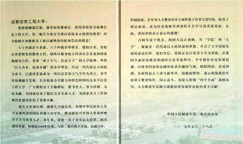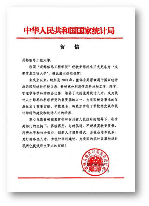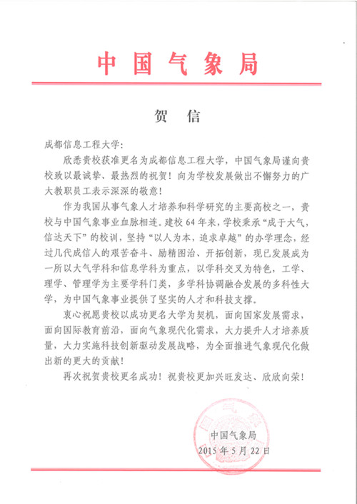 【本网讯】2015年4月28日,教育部批准我校正式更名为成都信息工程大学,中国气象局、国家统计局、中国人民解放军第二炮兵部队政治部、省内外兄弟高校、友好单位、政府机关向我校发来贺信70余封,祝贺我校更名成功。