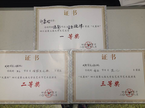 [本网讯]我院学生在四川省教育厅举办的“天翼杯”四川省第七届大学生艺术节中成绩颇丰。声乐节目《国防生之歌》荣获艺术表演类二等奖;舞蹈节目《花儿》获得艺术表演三等奖;书法甲组作品《抄录论语》获得书法组三等奖;摄影甲组作品《金色旋律》和乙组作品《回眸》分别获得摄影组一等奖和三等奖;美术作品乙组《青春等待》获得美术组三等奖。我院指导老师倪涛、肖瑜、邵璐、焦海龙、叶芮伶、刘俊彤分别获得现场展演活动“优秀指导老师”荣誉称号。(校团委)