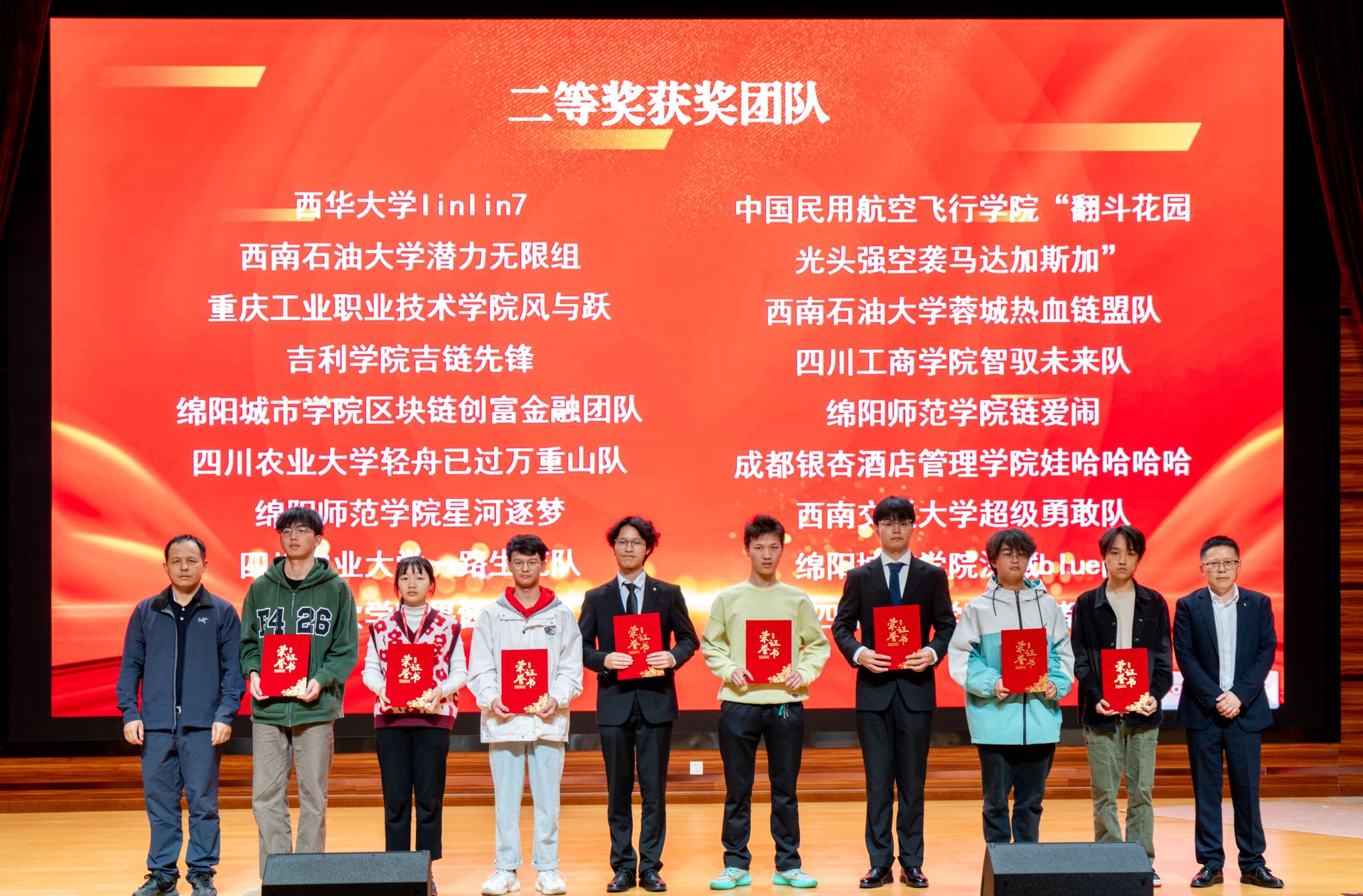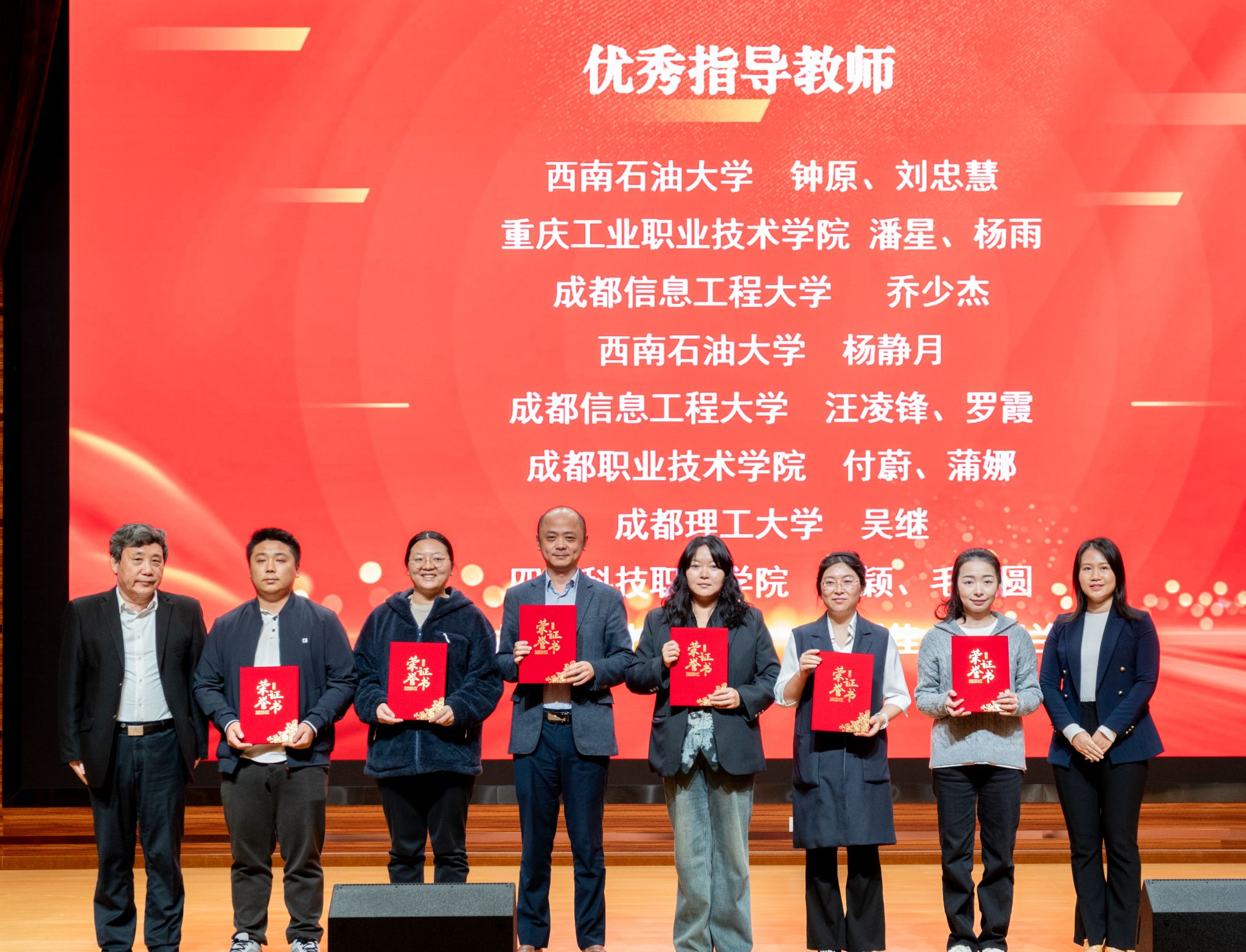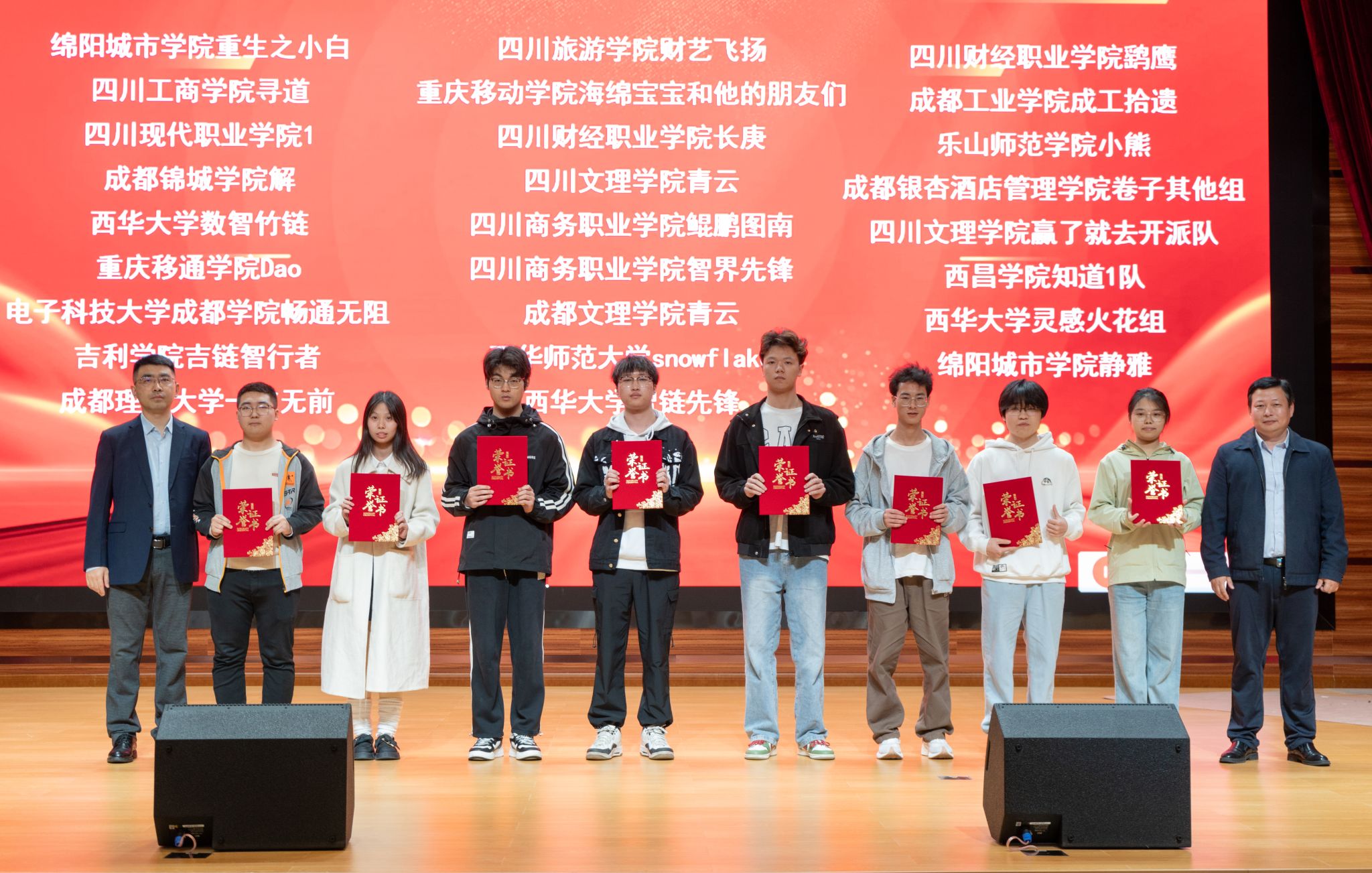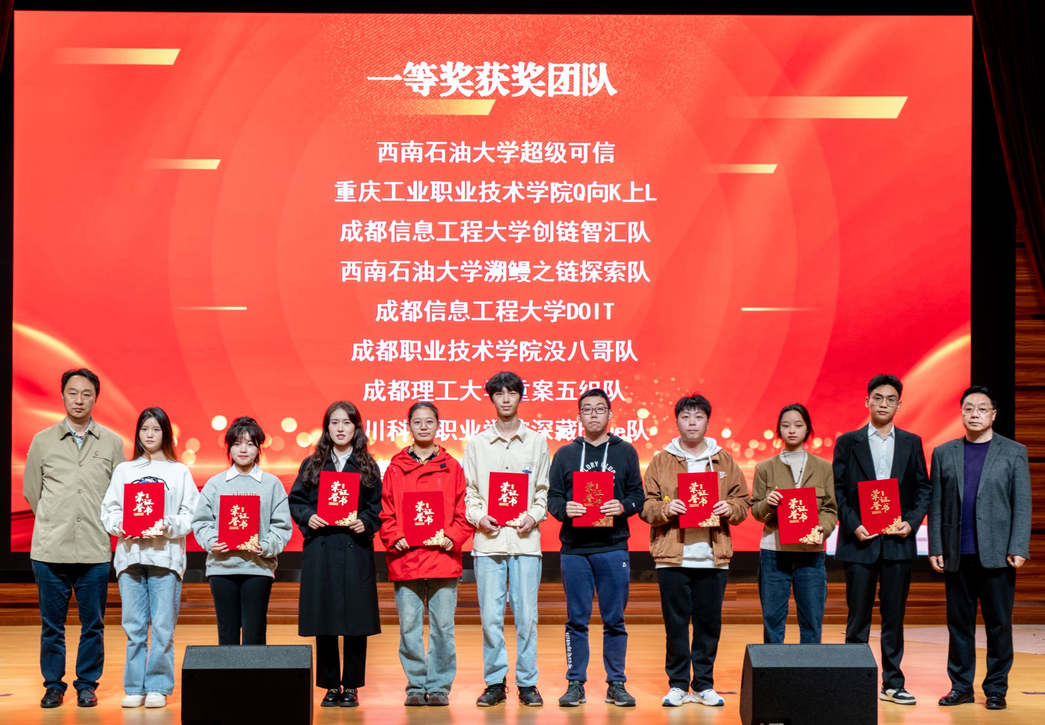 人工智能学院(区块链产业学院)党委副书记姜宇忠代表大赛组委会宣读了本次大赛各奖项名单。通过初赛、复赛和决赛的激烈比拼,共有9支队伍获得省级一等奖,其中专业技术组3支队伍、行业应用组6支队伍,分别来自成都理工大学、西南石油大学、成都信息工程大学、重庆工业职业技术学院、成都职业技术学院、四川科技职业学院。17支队伍获得省级二等奖,其中专业技术组5支队伍、行业应用组12支队伍,分别来自四川农业大学、西南交通大学、西华大学、绵阳师范学院、吉利学院等院校。26支队伍获得省级三等奖,其中专业技术组8支队伍、行业应用组18支队伍,分别来自成都理工大学、四川旅游学院、重庆移通学院、绵阳城市学院、四川工商学院、四川现代职业学院等院校。大赛还评选出了15名优秀指导老师。