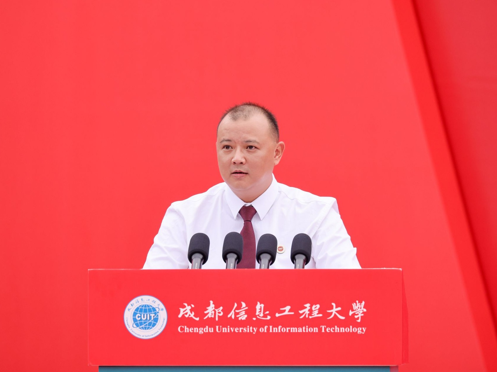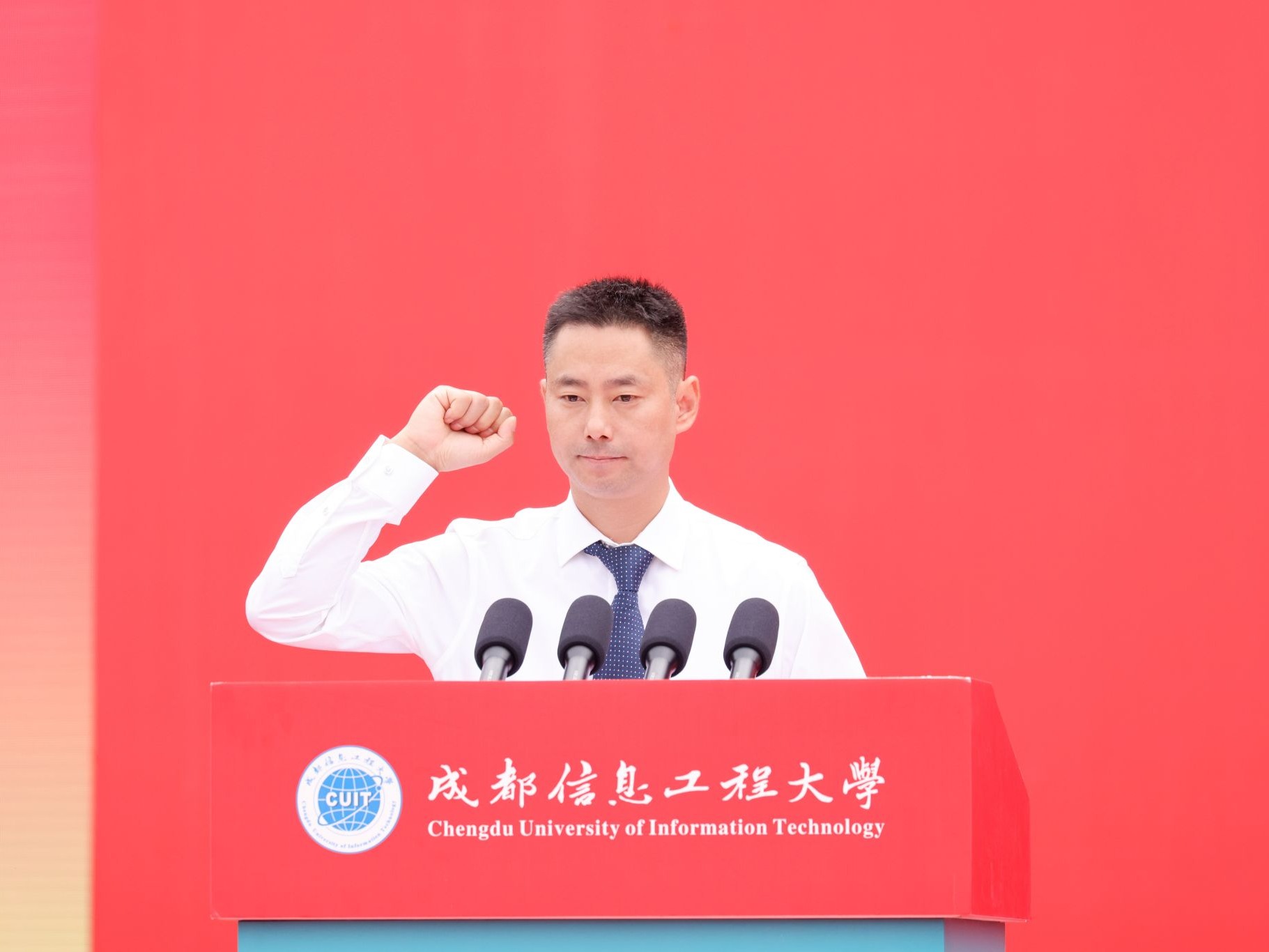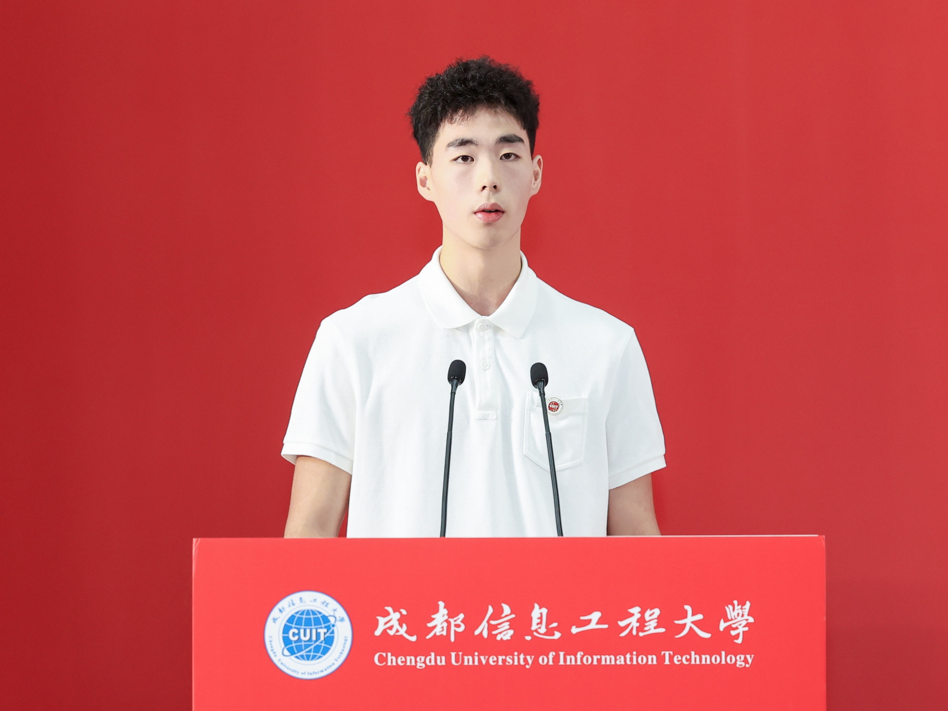 随后,主席台就座的领导和教师代表为新生代表佩戴成都信息工程大学校徽。这枚校徽不仅是“成信人”身份的象征,更是奉献青春力量,展现青年担当的使命传承。