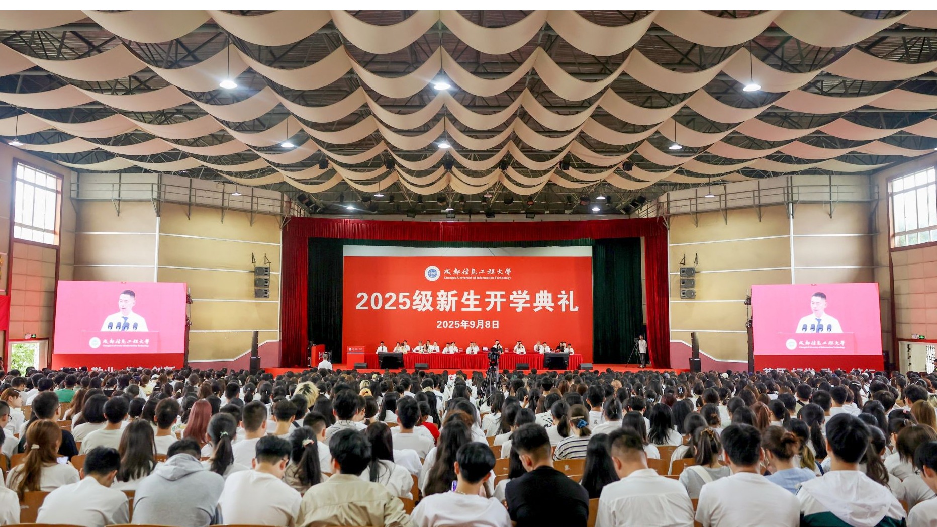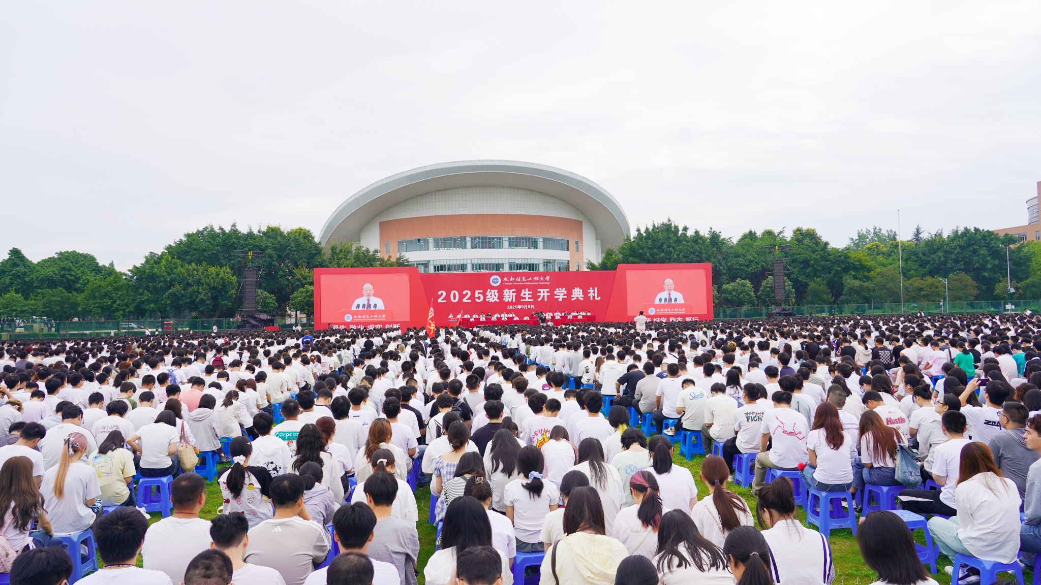 【本网讯】9月8日上午,成都信息工程大学2025级新生开学典礼在航空港校区第二田径场和龙泉校区大礼堂举行,并通过网络同步直播两校区活动现场盛况。学校党委书记沈火明、校长何建新,其他在校校领导王琪、杨奇才、舒红平、罗小蓉、陈权亮、何晋,相关职能部门负责人,各学院党委书记(副书记)、院长(副院长),家长代表,2025级学生辅导员,2025级全体同学参加典礼,共同见证7113名本科生、硕博研究生的人生新起点。典礼由学校副校长陈权亮主持。