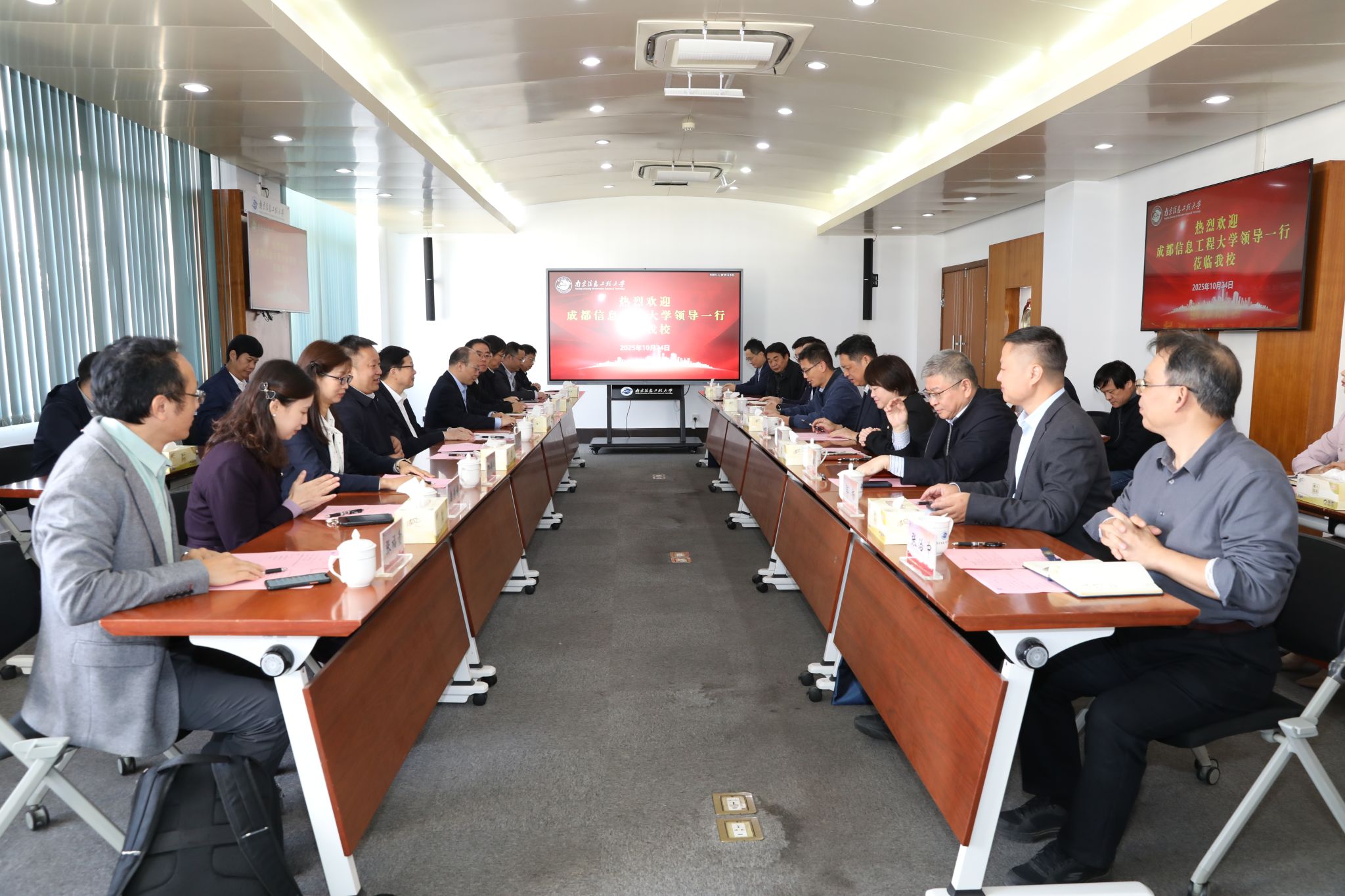【本网讯】10月23日—24日,学校党委书记沈火明、校长何建新带队赴南京信息工程大学开展调研交流。此次调研旨在学习先进成效经验,进一步加强校际合作与交流,推动学校人才培养、学科建设、科学研究高质量发展。23日下午,南京信息工程大学党委书记尚洪波会见了学校党委书记沈火明、校长何建新、副校长舒红平一行。24日上午举行座谈会,南京信息工程大学校长陈海山,副校长赵强、刘佳出席,会议由赵强主持。