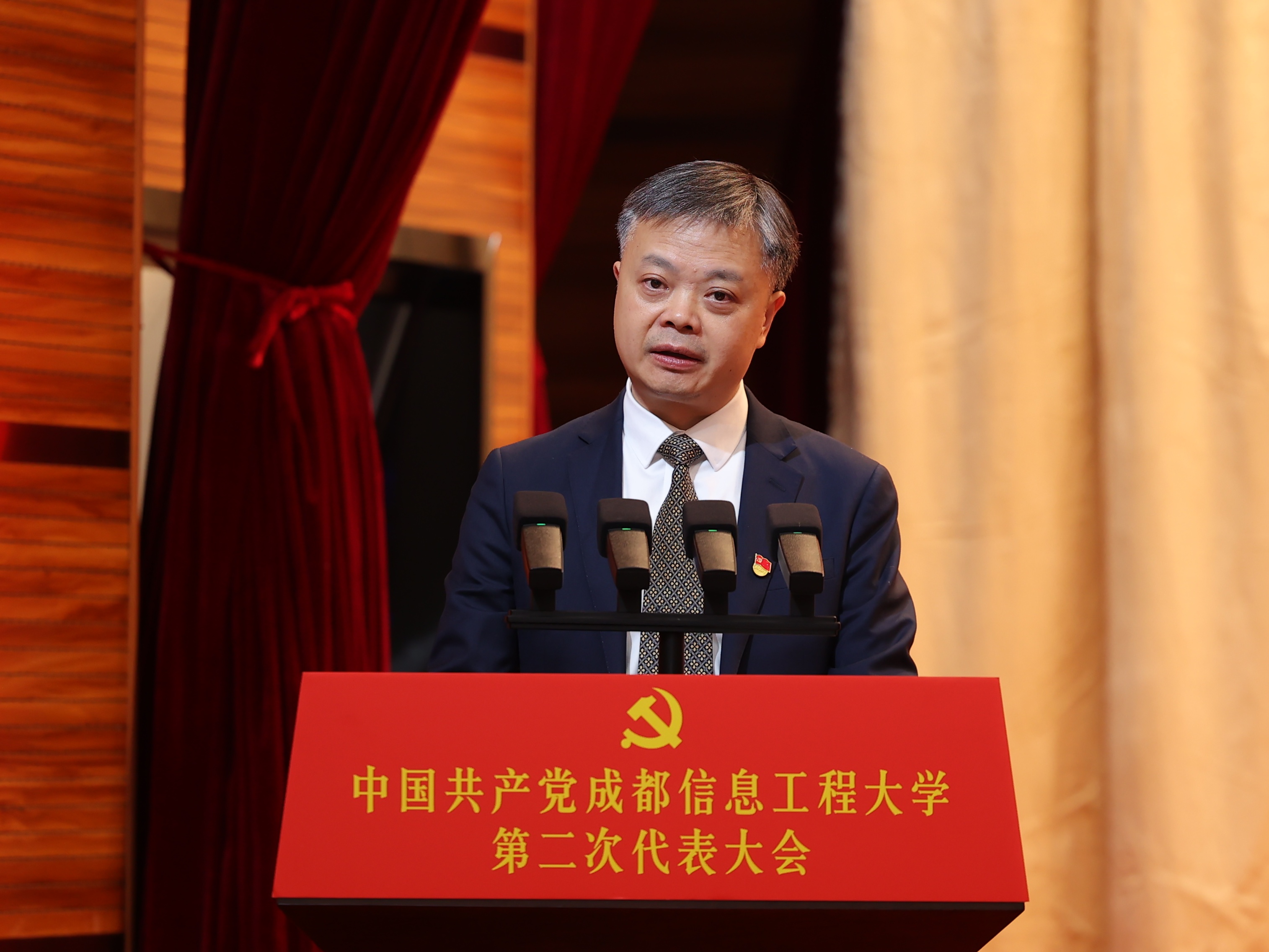 沈火明代表中国共产党成都信息工程大学第一届委员会向大会作了题为《乘势而上再攀高峰为加快建设特色鲜明的一流信息工程大学而努力奋斗》的报告。