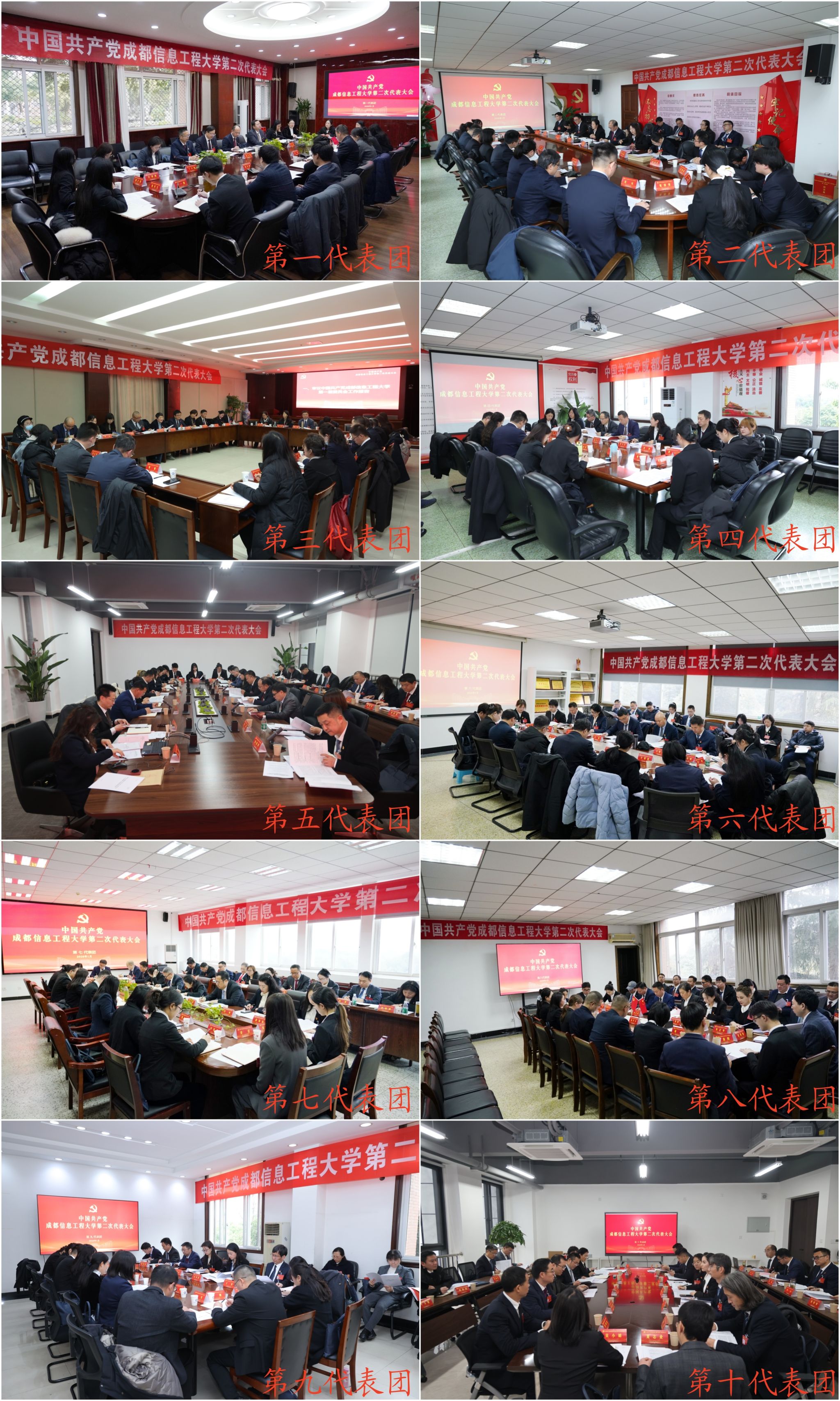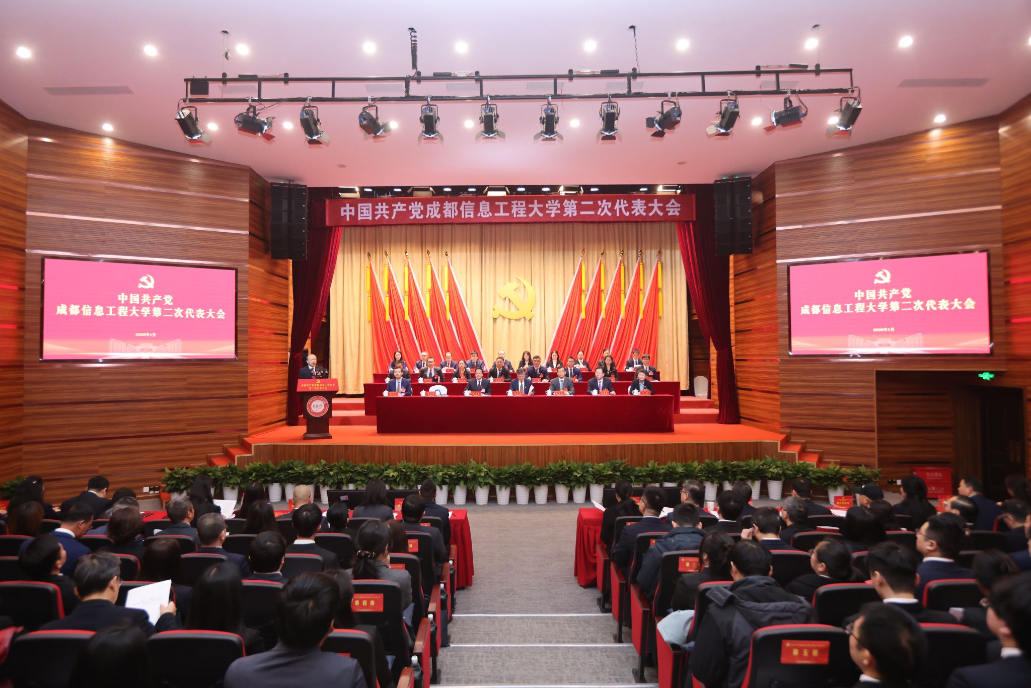 成信礼堂内气氛庄重热烈,主席台上方悬挂着“中国共产党成都信息工程大学第二次代表大会”的会标,十面鲜艳的红旗分列主席台两侧,正中簇拥着的党徽光彩夺目。