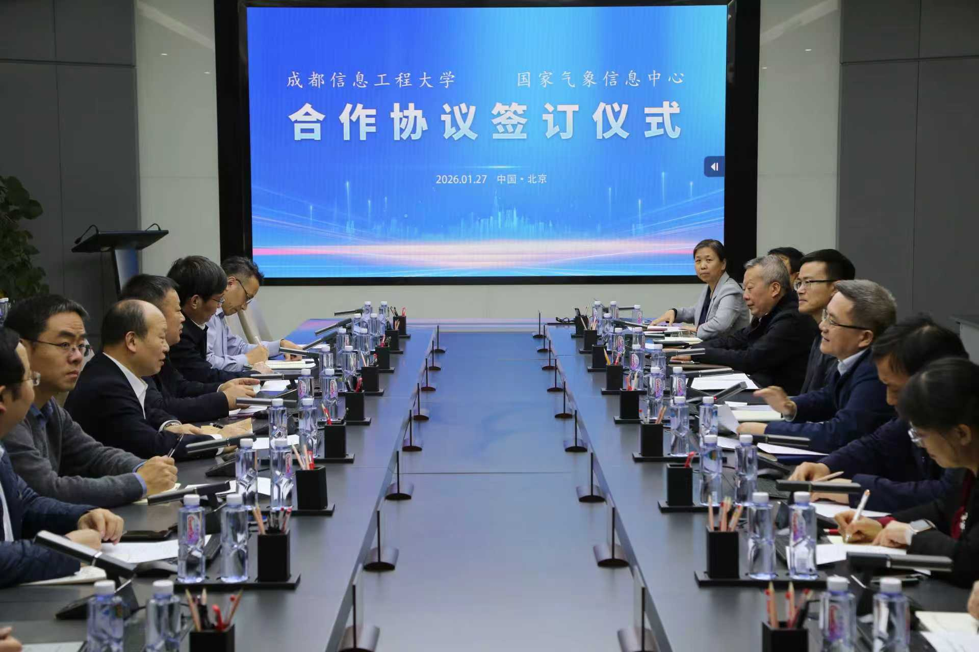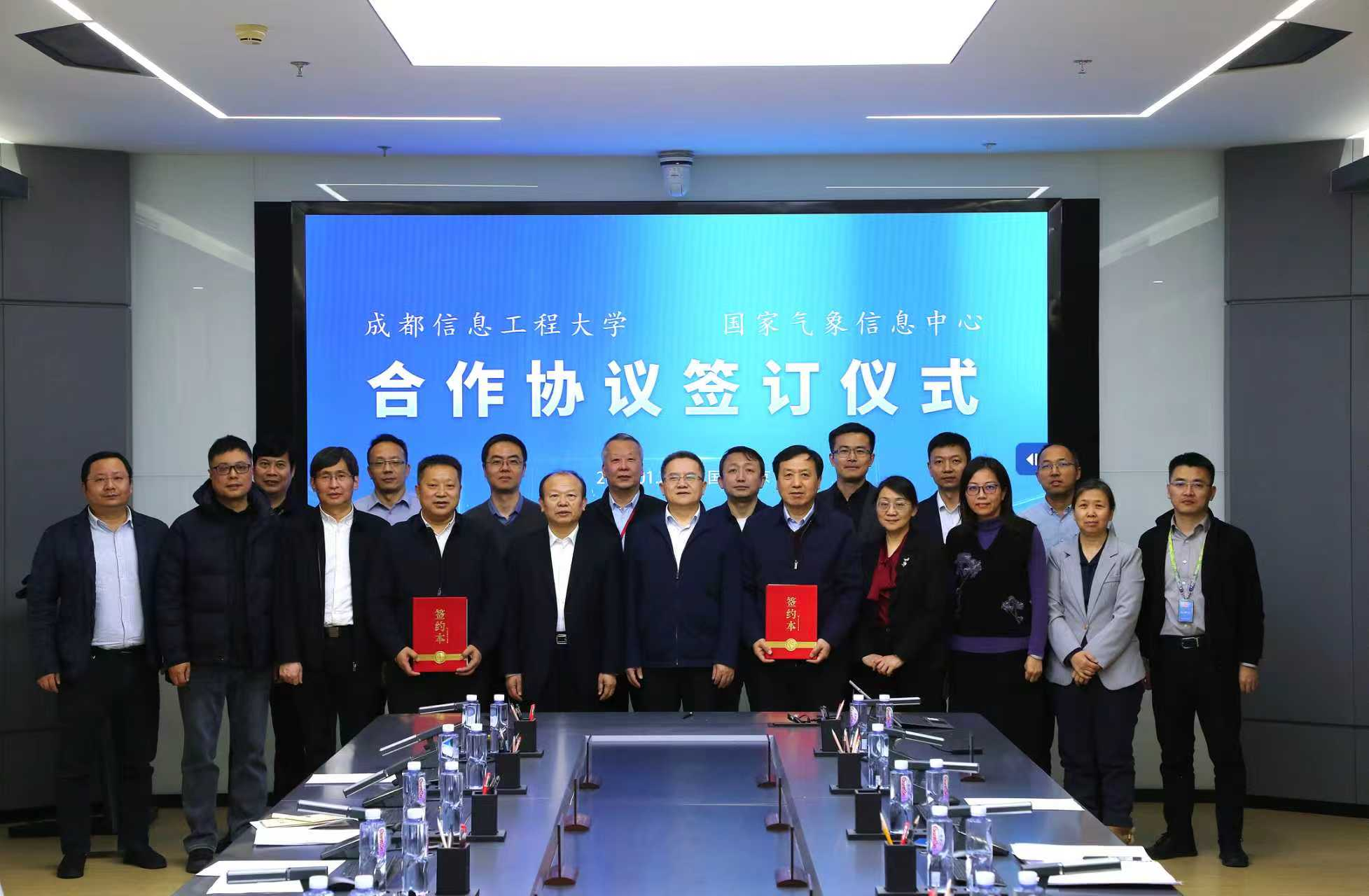 【本网讯】1月27日下午,为深化局校合作,学校与国家气象信息中心(以下简称“中心”)在北京正式签署了共建数据科学与大数据技术本科专业“英才班”合作协议。中心党委书记、主任肖文名,党委常委、副主任周自江,学校党委副书记、校长何建新,党委常委、副校长舒红平出席签约仪式。仪式由肖文名主持。