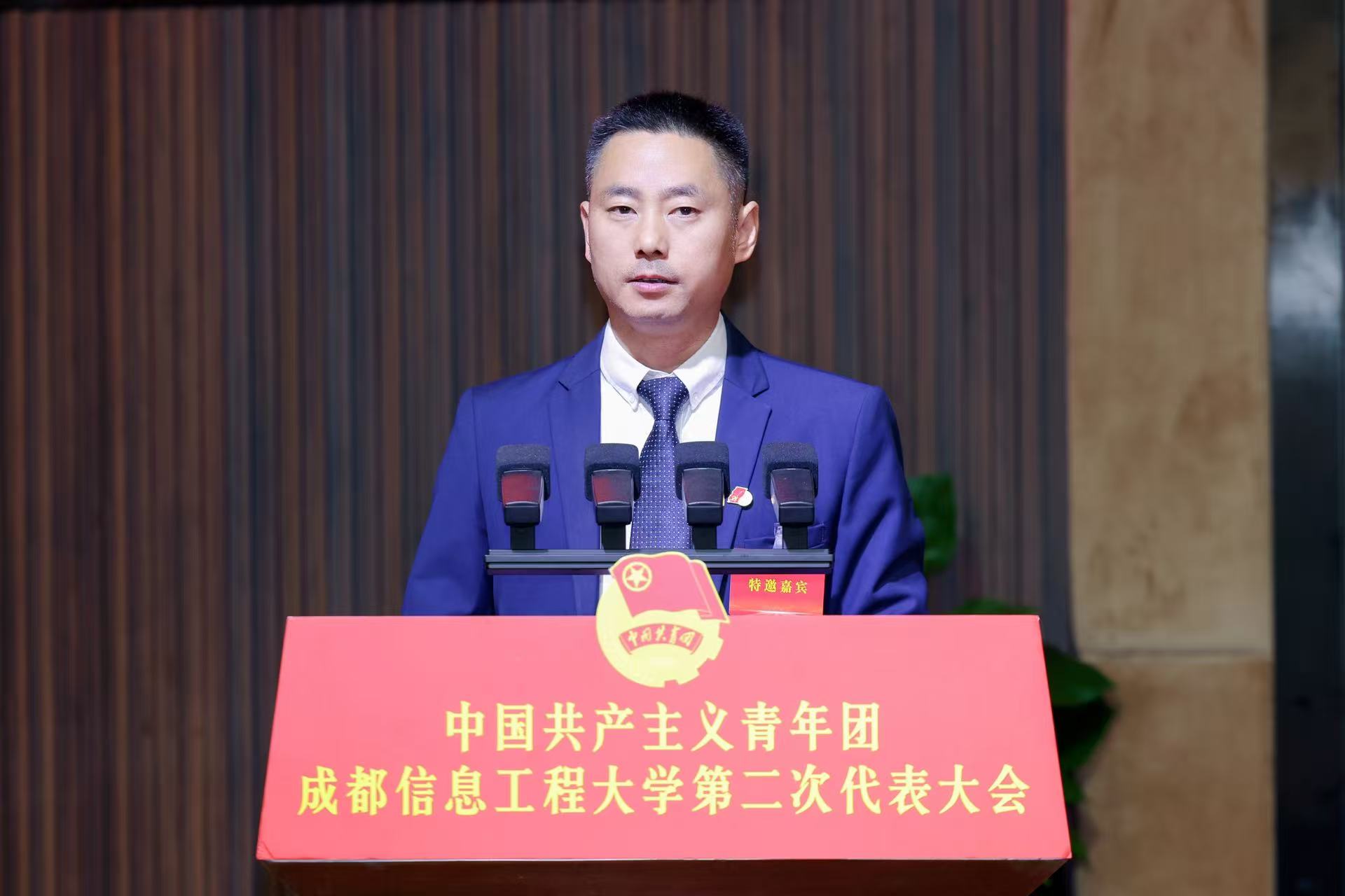 王冬冬代表上级团组织在大会开幕会上讲话。他表示,成都信息工程大学自建校以来,始终秉承“以人为本、追求卓越”的办学理念,深度融入国家战略与区域发展,为培养堪当民族复兴大任的高素质应用型人才作出了重要贡献。成都信息工程大学团委在学校党委和上级团组织的坚强领导下,始终坚守为党育人、为国育才初心使命,紧紧围绕学校中心工作和青年成长需求,思想引领走深走实,各项工作取得了显著成效。他指出,党的十八大以来,习近平总书记对青年工作作出一系列重要指示,为新时代团的工作指明了方向。他代表团市委提出四点希望:一是要强化思想政治引领,要发挥青年讲师团成员、“青马工程”学员等先进骨干的作用,推进党的创新理论青年化传播;二是要动员青年实干建功,充分发挥“挑战杯”“三下乡”等活动的牵引作用,激发学生在科技创新、志愿服务等领域创新创造热情,彰显青春价值;三是要聚焦青年需求,充分发挥共青团贴近青年的独特优势,竭诚服务青年学生成长成才;四是要深化团学改革,永葆组织先进活力,全面落实中央关于党建带团建的决策部署,不断保持和增强政治性、先进性、群众性。