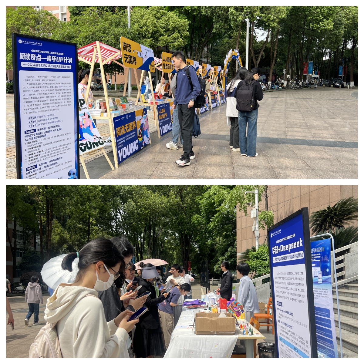 本届文化周在两校区图书馆大门广场设立综合展区,聚焦数字资源与前沿科技。师生沉浸式体验了“云端书库——24小时在线智慧大脑”,了解图书馆电子资源的特色与应用;参与“华知+DeepSeek”AI阅读工具互动,探索学术研究智能化新范式;在“阅读奇点——青年UP计划”精品书展中选购科技创新、人工智能主题书籍及文创产品。同时,文泉学堂知识库推出“迎接AI 勇立潮头”竞答活动,扫码答题赢大奖,“AI赋能”数字阅读荐书等活动,内容丰富多彩。