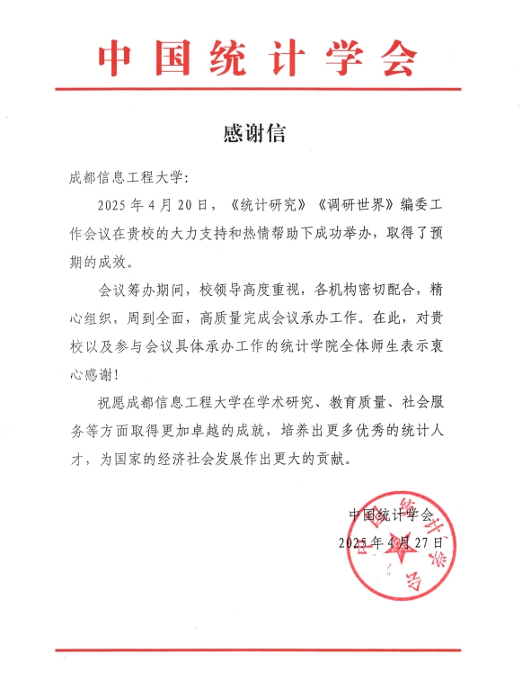 【本网讯】近日,国家统计局主管的中国统计学会向我校发来感谢信,对我校筹办2025年《统计研究》《调研世界》编委工作会议所提供的大力支持与热情帮助表示衷心感谢。此次会议于4月20日在成都成功举办,取得了圆满成效,获得了与会各方的高度评价。