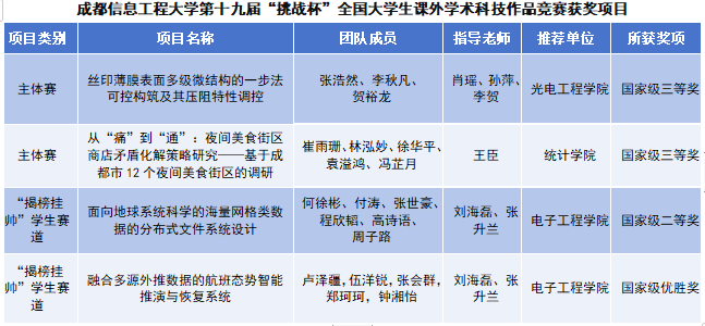 自赛事启动以来,学校高度重视、系统部署,由校团委牵头组织,相关职能部门及各学院协同联动,通过举办校级选拔、专题培训、专家辅导、模拟答辩等环节,全程赋能、层层打磨,全面提升参赛项目的核心竞争力。此次优异成绩的取得,充分彰显了我校多学科交叉的育人成效,展现了学子“敢挑战、能创新”的青春锐气,也是学校持续推进科技创新与实践育人深度融合的生动体现。