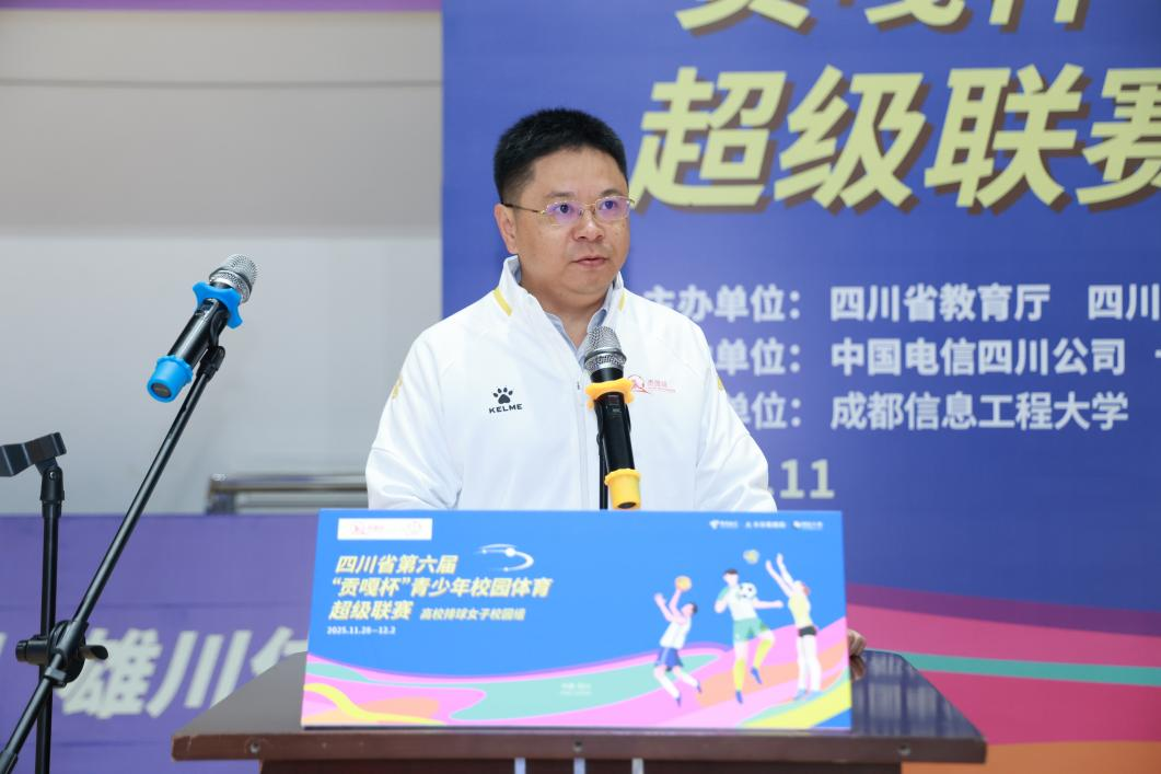 何晋在致辞中介绍了我校的基本情况,以及学校丰硕的体育育人成果。他表示,“贡嘎杯”作为本省青少年校园体育的最高级别赛事,蕴含着体教融合的深刻内涵。它不仅是激励青少年超越自我、追求卓越的竞技平台,也是展现高校体育育人成效的重要窗口,更是弘扬体育精神、凝聚青春力量的文化盛事。我校必定通力协作、密切配合,全力做好赛事服务保障,为赛事营造一个安全、公平、有序、温馨的竞赛环境。他希望参赛队赛出风格、赛出水平,取得优异成绩,大赛取得圆满成功。