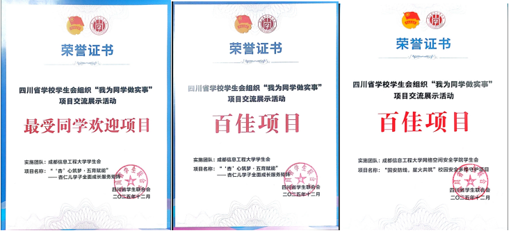 【本网讯】12月14日至15日,2025年四川省学校学生会组织“我为同学做实事”项目交流展示活动在成都举办。经过学校初选推荐、全省初选、同学满意度调查、现场答辩展示四个环节,我校推报项目在全省214所学校381个申报项目中脱颖而出。学校学生会“‘杏’心筑梦·五育赋能”——杏仁儿学子全面成长服务矩阵项目,经学生观察团和大众评审团综合评议,荣获四川省学生会服务同学“最受同学欢迎项目”(全省共30项)。该项目与网络空间安全学院学生会“国安防线,星火共筑”校园安全多维守护项目,也双双入选四川省学生会组织服务同学“百佳项目”(全省共100项)。三项荣誉的取得,集中彰显了我校服务育人的扎实成效。