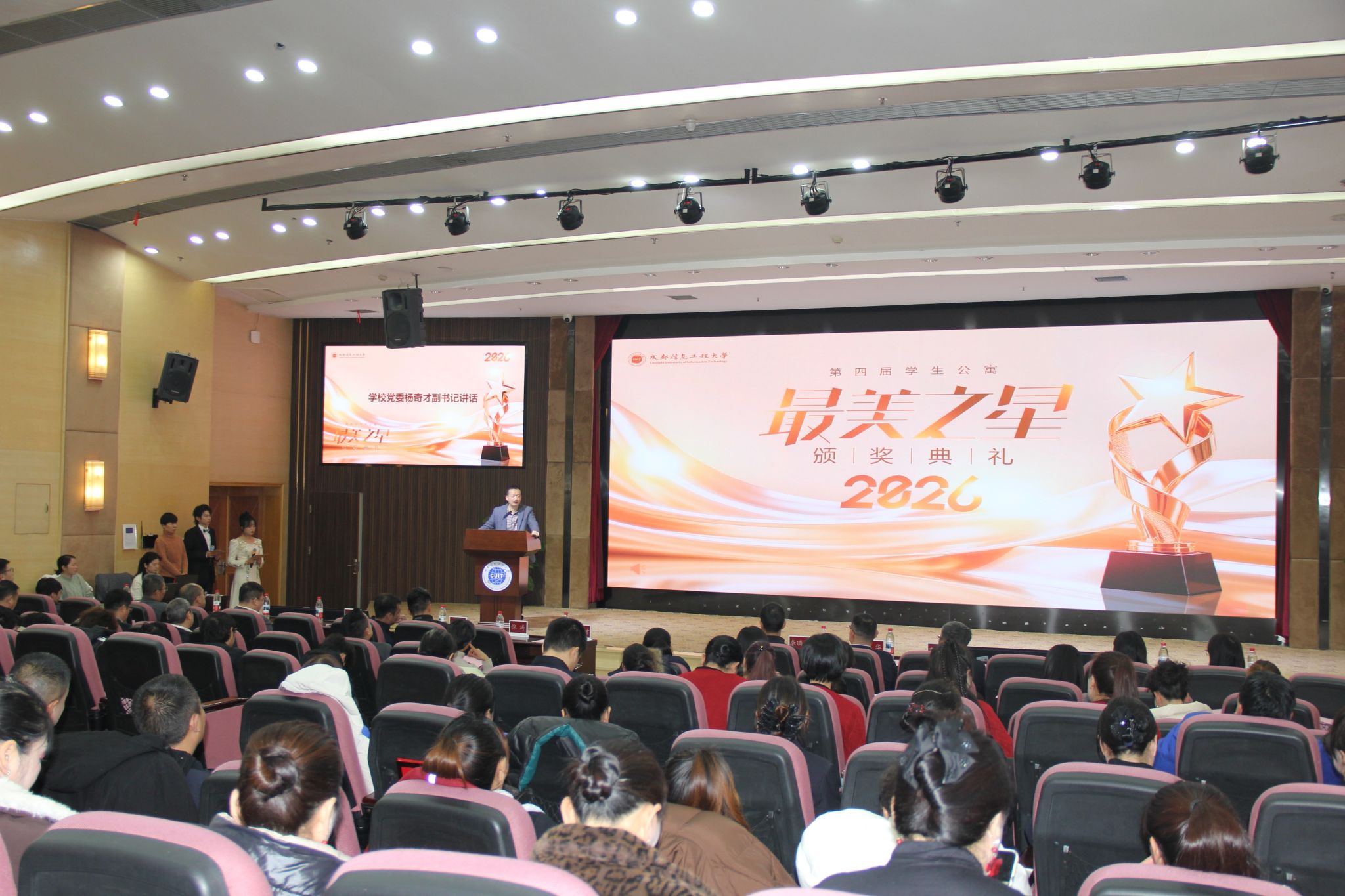 【本网讯】1月14日下午,学校第四届学生公寓“最美之星”颁奖典礼在航空港校区国际会议厅落幕。学校党委副书记杨奇才出席典礼并讲话。党委宣传部、党委学生工作部、后勤基建处等部门负责人,相关单位工作人员代表,学生代表共100余人参会。