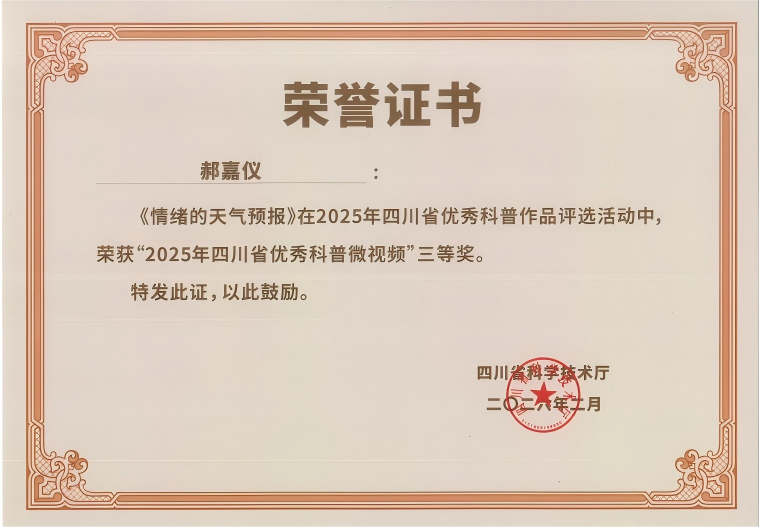 【本网讯】近日,四川省科学技术厅正式公布了2025年四川省优秀科普作品名单。在科技处的精心组织与统筹下,我校报送的科普作品在众多参赛项目中脱颖而出,其中由光电工程学院(人工影响天气学院)人工影响天气科普基地创作的科普微视频《情绪的天气预报》荣获2025年四川省优秀科普微视频三等奖。此次评选共遴选出优秀科普微视频49部,我校作品成功获奖,充分彰显了学校在科学普及与科技创新协同发展方面的扎实成效。