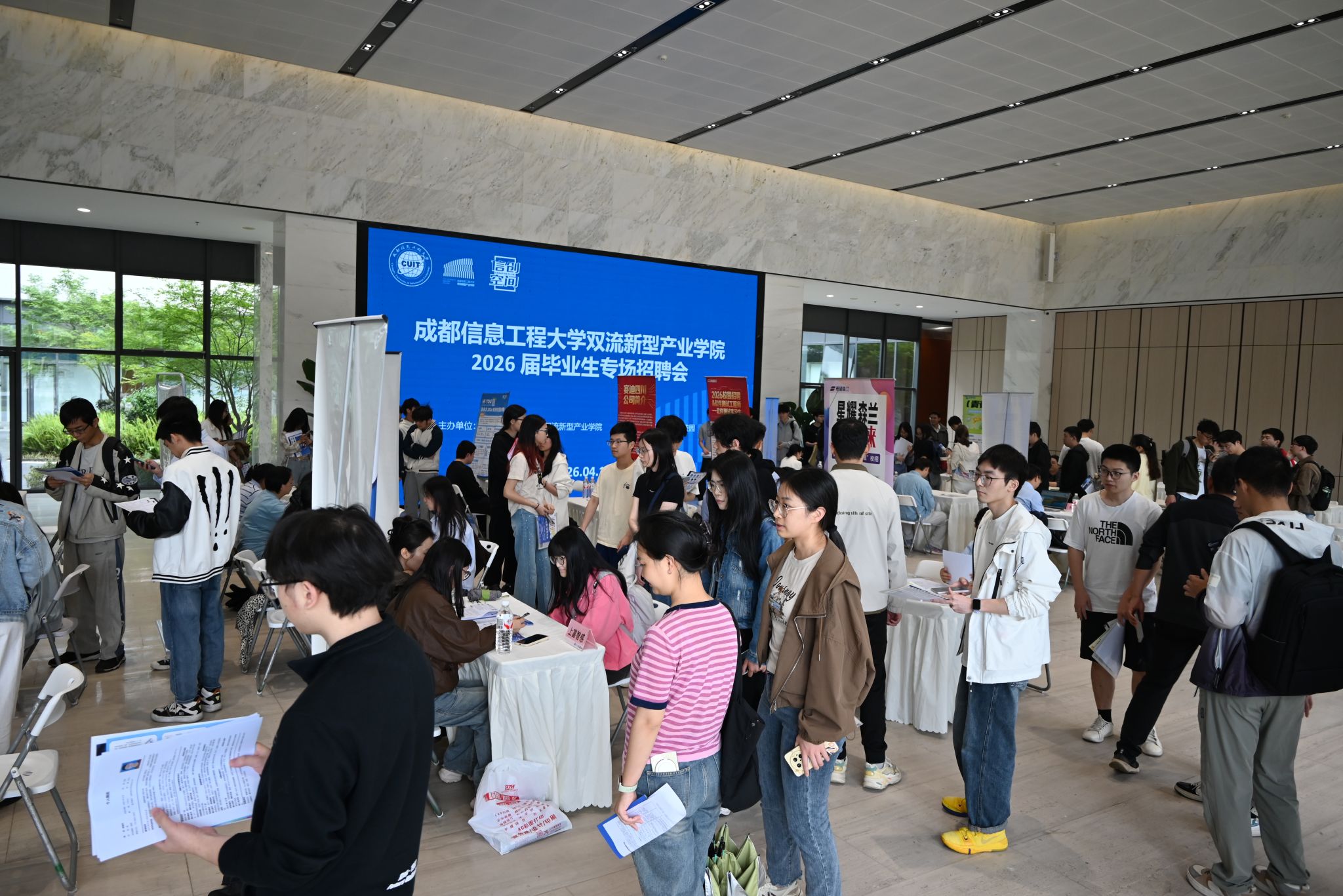 【本网讯】为深入贯彻立德树人根本任务,深化校企合作,服务地方经济发展,4月15日下午,双流新型产业学院举办了2026届毕业生专场招聘会。本次招聘会吸引了京东方科技集团股份有限公司、通威太阳能有限公司、赛迪研究院、希望森兰科技股份有限公司等23家双流区重点及对口优质企业前来揽才,现场提供岗位涵盖集成电路、人工智能、自动化、智能制造、网络安全等多个领域,百余名毕业生踊跃参会,积极与用人单位交流。