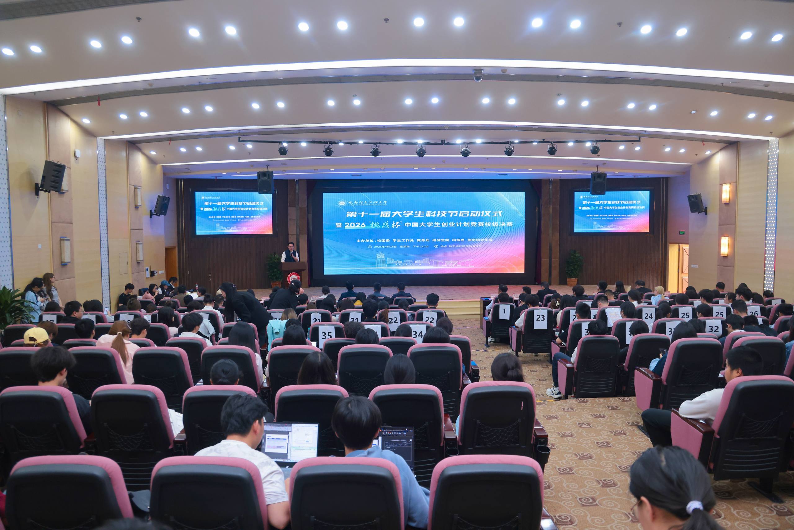 【本网讯】4月16日下午,学校第十一届大学生科技节启动仪式暨2026年度“挑战杯”中国大学生创业计划竞赛校级决赛在航空港校区国际会议厅举行。学校副校长陈权亮,学生工作处、教务处、研究生院、科技处、校团委、创新创业学院等职能部门负责人,各学院分管竞赛工作负责人、团委书记及参赛师生代表300余人共同参与活动。活动由校团委副书记彭承宗主持。