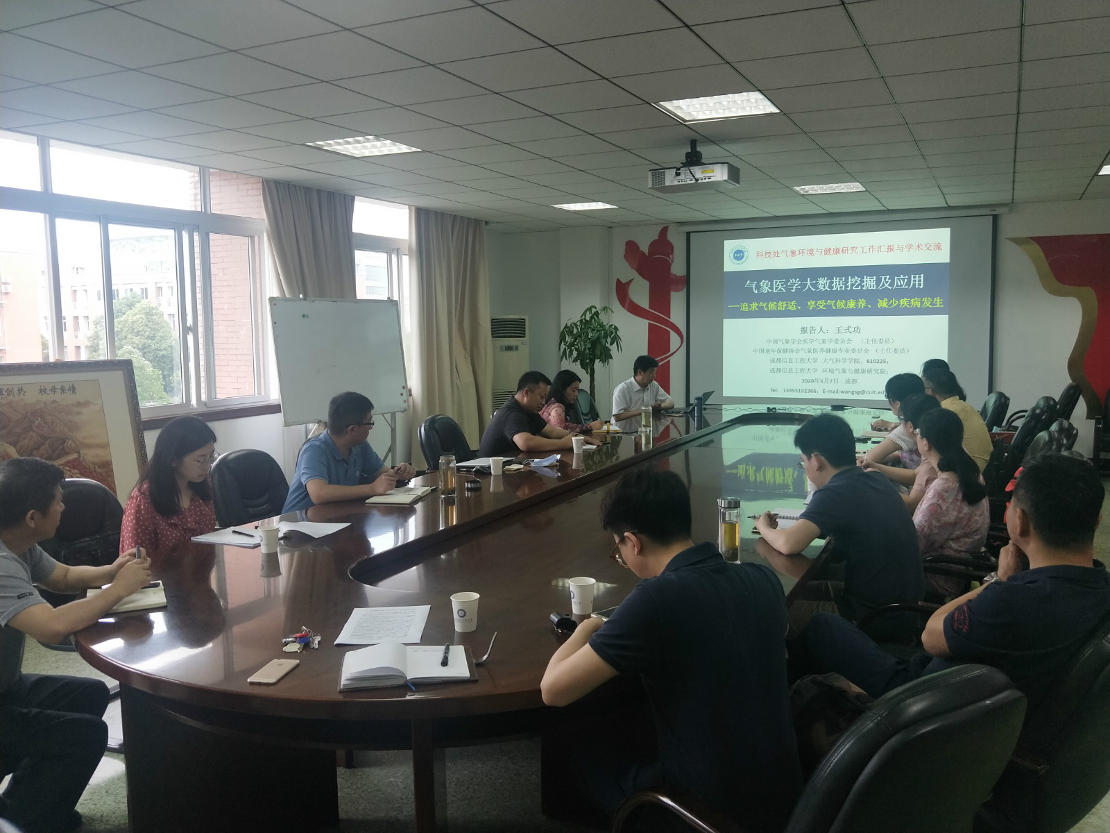 学校领导与学校科研人员交流环境气象与健康研究工作