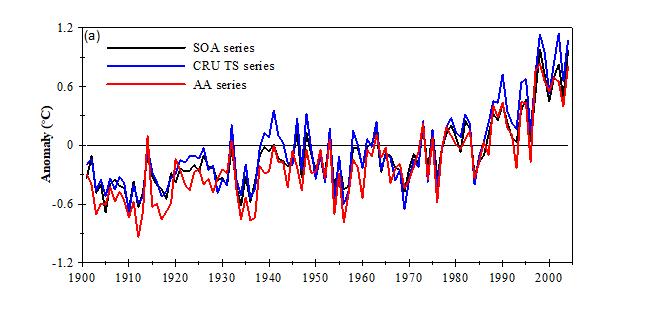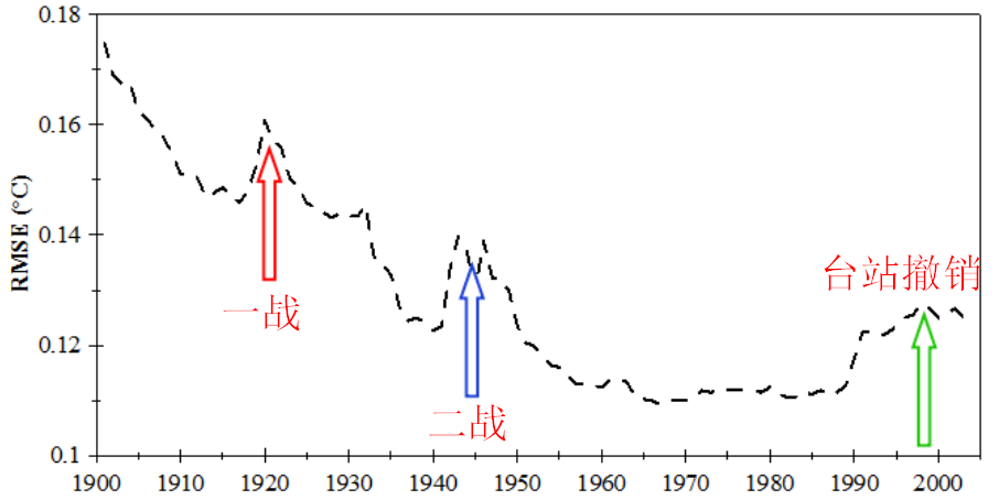 (三次误差峰值分别由两次世界大战和90年代以来台站撤销造成)