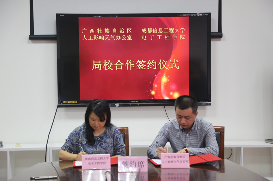 杨玲和曹江平分别代表双方单位签署了《广西壮族自治区人工影响天气办公室-成都信息工程大学电子工程学院合作协议》。