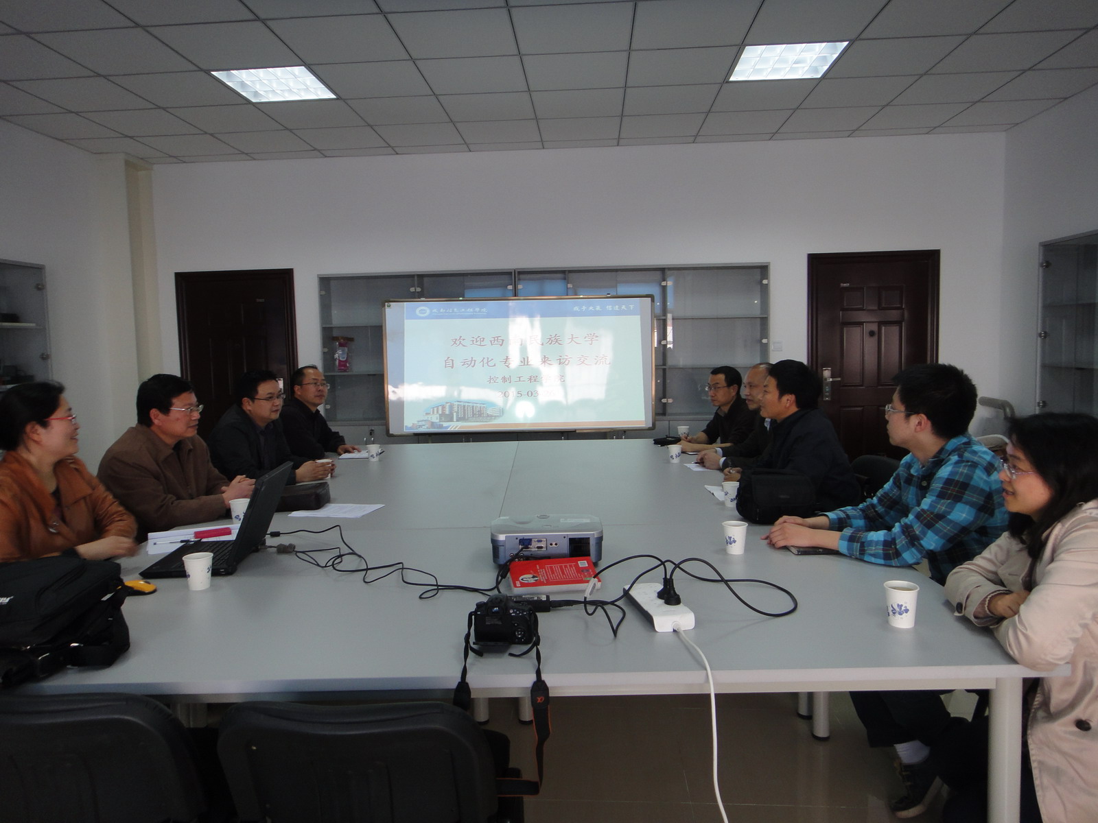 彭安金教授介绍了西南民族大学自动化专业的发展历程、目前状况及调研的目的。严寒冰介绍了控制工程学院的专业构成,以及我院自动化专业的教育部卓越计划试点建设进展、测控技术与仪器专业和电气工程及其自动化专业的四川省卓越计划试点建设进展。周蓉和瞿福存对自动化专业的培养方案设置的出发点、专业定位、卓越计划的要求、专业认证的要求等进行了说明,详细阐释了我院自动化专业人才培养方案的课程设置与卓越计划、专业认证之间的关系,以及培养目标的达成度评价方法。蒋世奇向来访客人介绍了近年测控技术与仪器专业在《工程实践》课程中的优秀项目。双方还就实践教学环节的设置、实施方法、实践能力培养过程的设计进行了深入探讨。