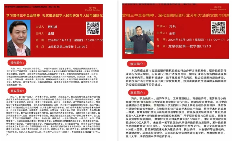 为了将党的引领和学科教育教学深度融合,为国家和社会培养时代所需的统计人才,本年度学院党委先后7次邀请校外专家学者、企业领导等进校将党的二十大、二十届三中全会精神与当前统计学科发展、基层统计实务工作、统计人才培养等进行深度融合给学院师生作专题讲座。