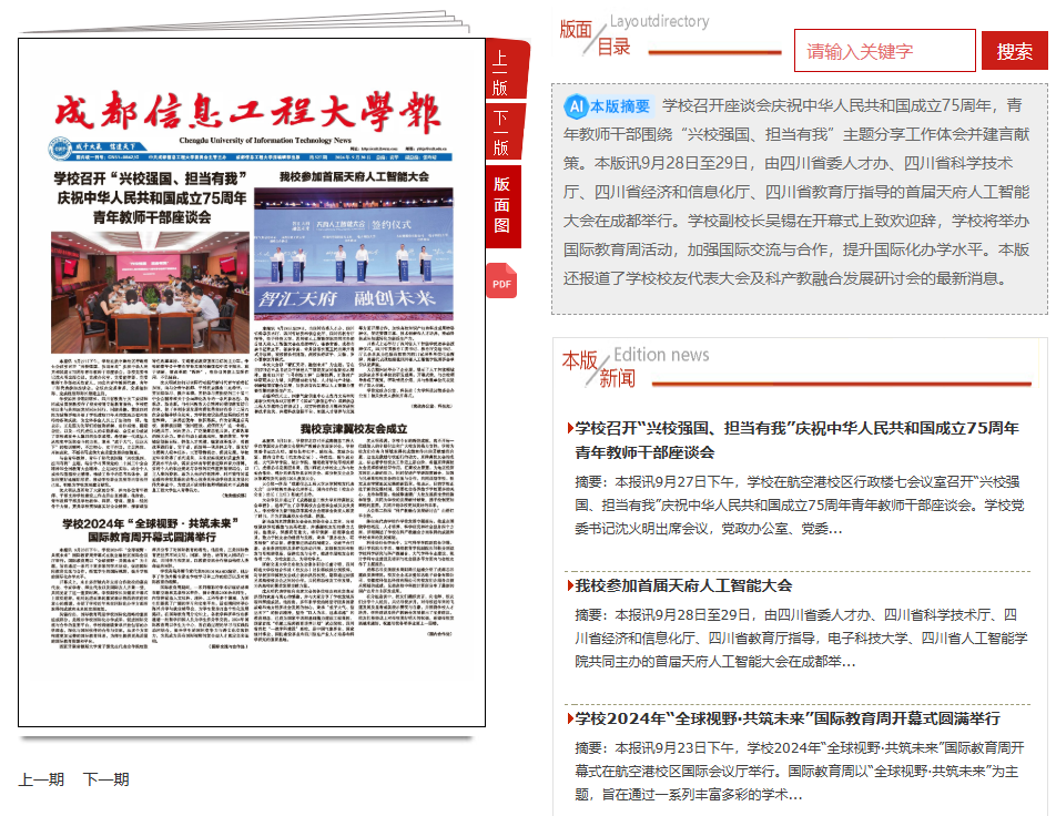 《成都信息工程大学报》坚持守正创新、精编严审,全年刊发12期(520—531期),刊登稿件290余篇,围绕学习贯彻习近平新时代中国特色社会主义思想主题教育、全国两会、党纪学习教育、党的二十届三中全会、全国教育大会、宪法宣传教育、网络安全宣传周、师德师风、研考指南、就业导航、青春榜样等20个思想理论和成信文化特色专版专栏。