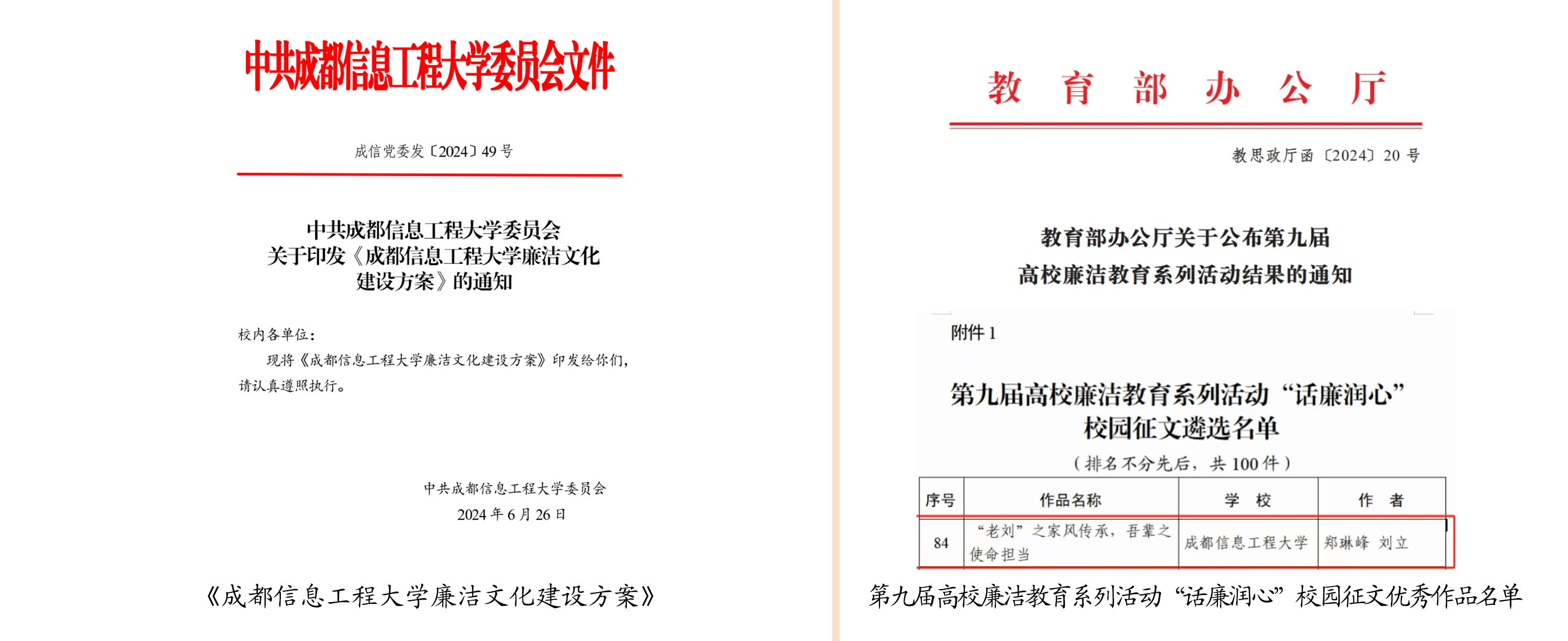 2.多点发力,推进校园文化专项建设。全面推进校园廉洁文化项目建设,联合纪委办公室发布《成都信息工程大学廉洁文化建设方案》,积极培育校园文化建设精品项目,制作学校廉洁文化宣传片,构建和维护风清气正政治生态和教书育人环境。加强文化作品推优活动,学校师生团队原创文化音乐视频《炽热青春》,分别获得第七届四川大学生网络文化节微视频组四川省二等奖和校园歌曲组四川省三等奖,《大运“小青椒”工作日志》获动漫组四川省二等奖。宣传部指导并推荐的文章《“老刘”之家风传承,吾辈之使命担当》获教育部第九届高校廉洁教育系列活动“话廉润心”校园征文优秀作品,该作品将在央视网、中国大学生在线、中国教育发布等平台进行展播。