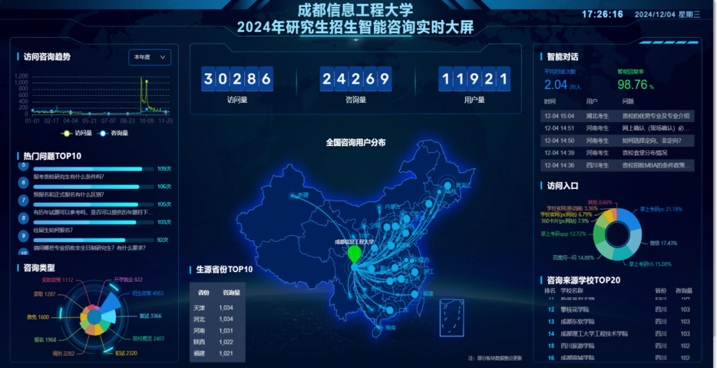 (2)线上宣传精准多样。研究生院今年首次举办的“研究生招生直播咨询会”吸引了454,990次B站浏览、244,000微博热度和1,448条弹幕评论,覆盖超2万考生。引入了机器人智能问答系统,提供24小时在线咨询,累计处理220条留言,访问量达30,286次,问题咨询24,269次,服务用户11,921人。首次使用智能电话服务接收1,260通来电,总通话时长37小时55分1秒,覆盖31省份,问题库累计94条,短信发送量250条,有效响应考生咨询。