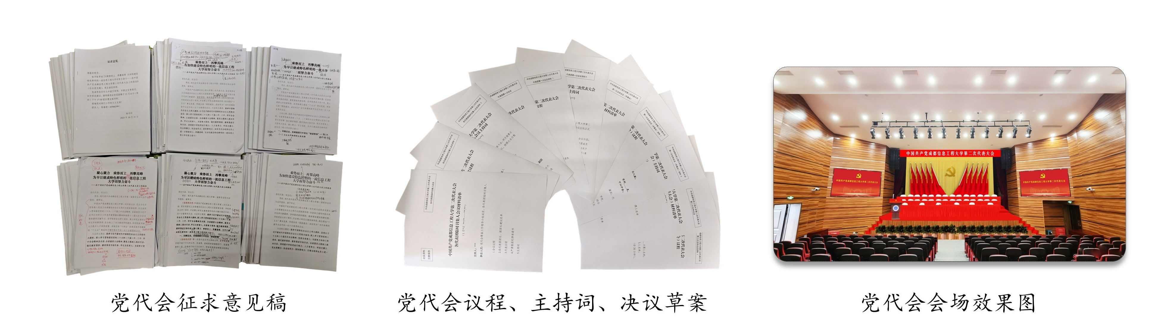 (一)扎实推进党代会筹备工作。在文稿起草方面,坚持“集思广益、精益求精”的原则,起草组深入开展调查研究,广泛征集各级党组织和师生代表的意见建议,历经数十次易稿和多轮专题研讨、集中打磨,高质量完成了题为《乘势而上再攀高峰为加快建设特色鲜明的一流信息工程大学而努力奋斗》的大会报告。同时,统筹完成了大会议程、主持词、决议草案等一系列重要会议文稿的起草工作。在会务筹备方面,制定了详尽的筹备工作方案,确保各项准备工作无缝衔接、万无一失,为党代会的胜利召开奠定了坚实基础。