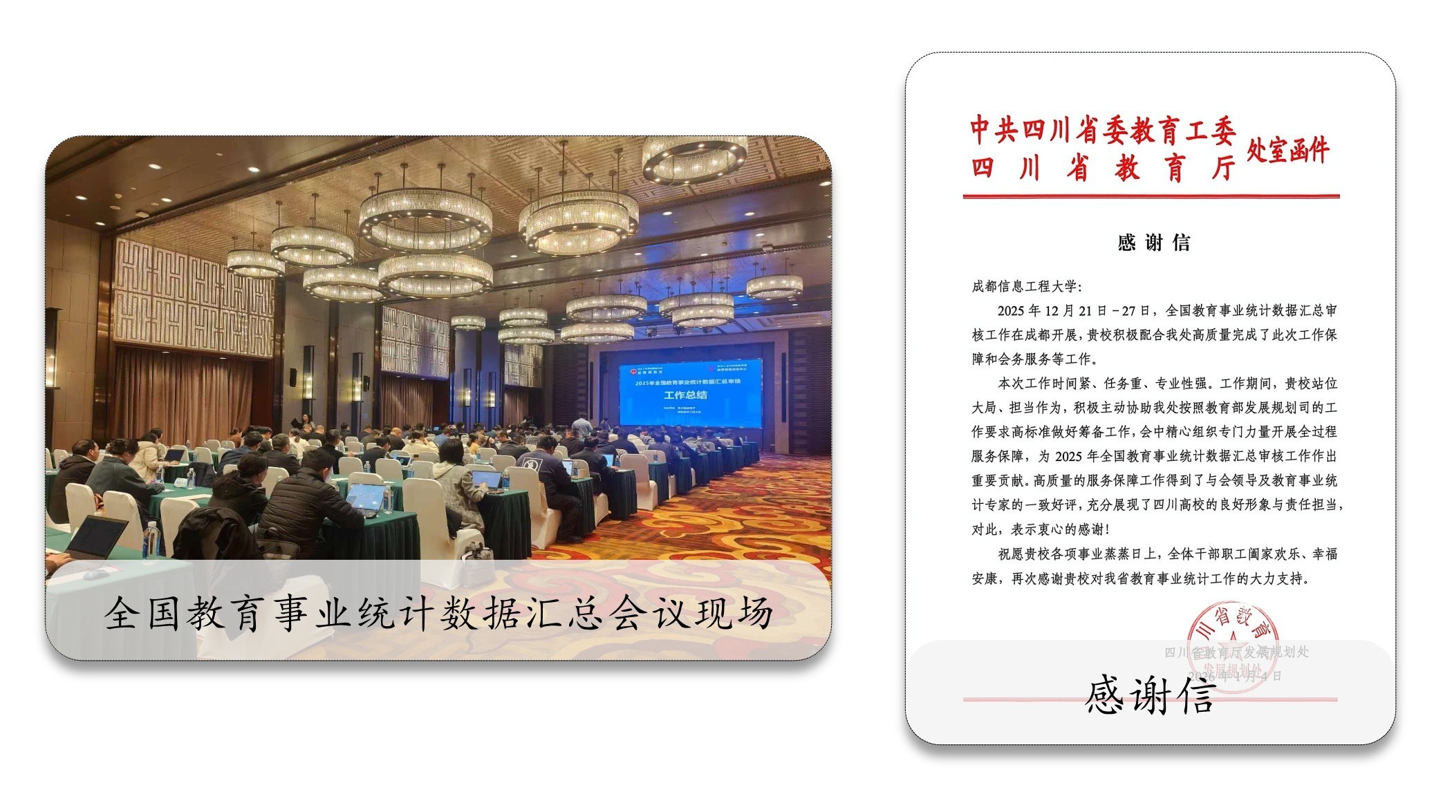 (四)高质量保障全国教育事业统计数据汇总审核工作。积极与教育部发展规划司、教育管理信息中心、四川省教育厅等上级单位沟通协调,作为会议协办单位高效保障2025年全国教育事业统计数据汇总审核工作顺利开展,高质量服务来自全国31个省、直辖市、自治区教育厅与教委的领导及专家,在全国教育事业统计战线很好地宣传了学校及统计学科,受到教育厅来信表扬。