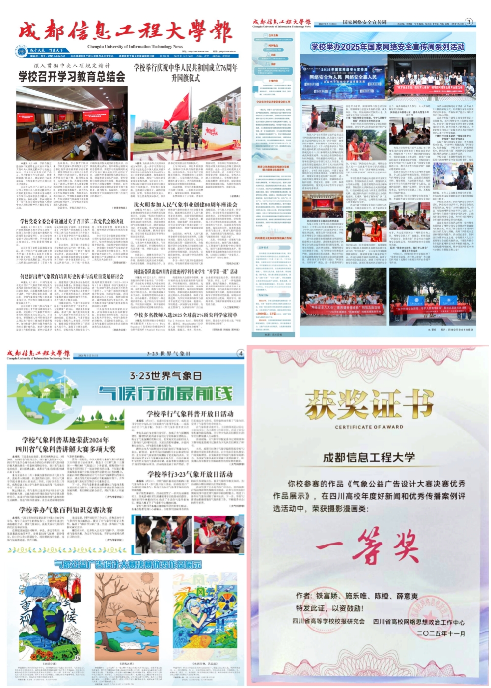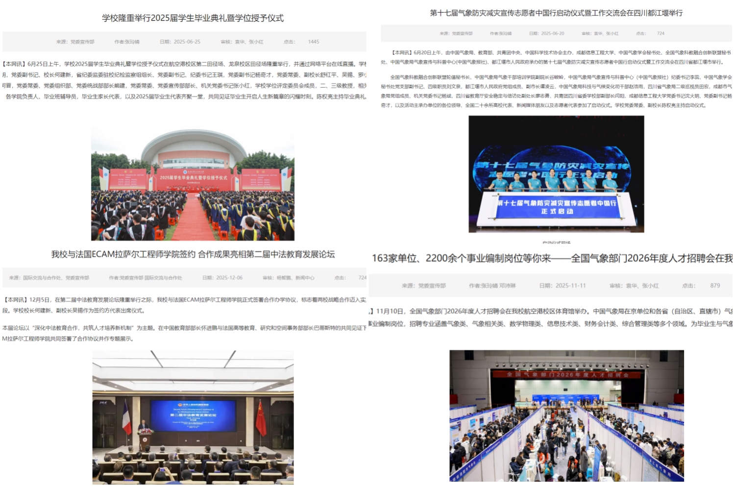 紧扣教学科研、管理服务、人才培养等中心工作,深入挖掘一线先进典型与经验成果。全年围绕重大主题策划推出深度报道30余篇,完成重点活动摄影摄像支持120余次,审核发布各类校园新闻稿件1100余篇。精心编印校报12期,刊发稿件200余篇,其中1件作品荣获省高校年度好新闻和优秀传播案例摄影漫画类一等奖。高质量完成《2024年中国气象年鉴》校对编辑等专项工作。通过举办新闻策划、写作、新媒体运营、摄影摄像等系列专题培训,持续提升宣传队伍“脚力、眼力、脑力、笔力”。