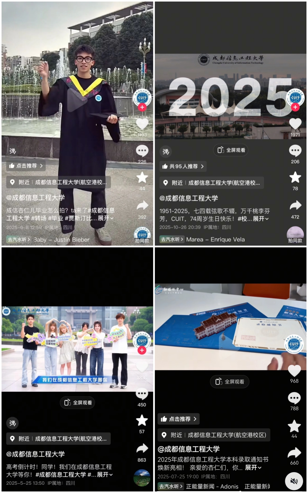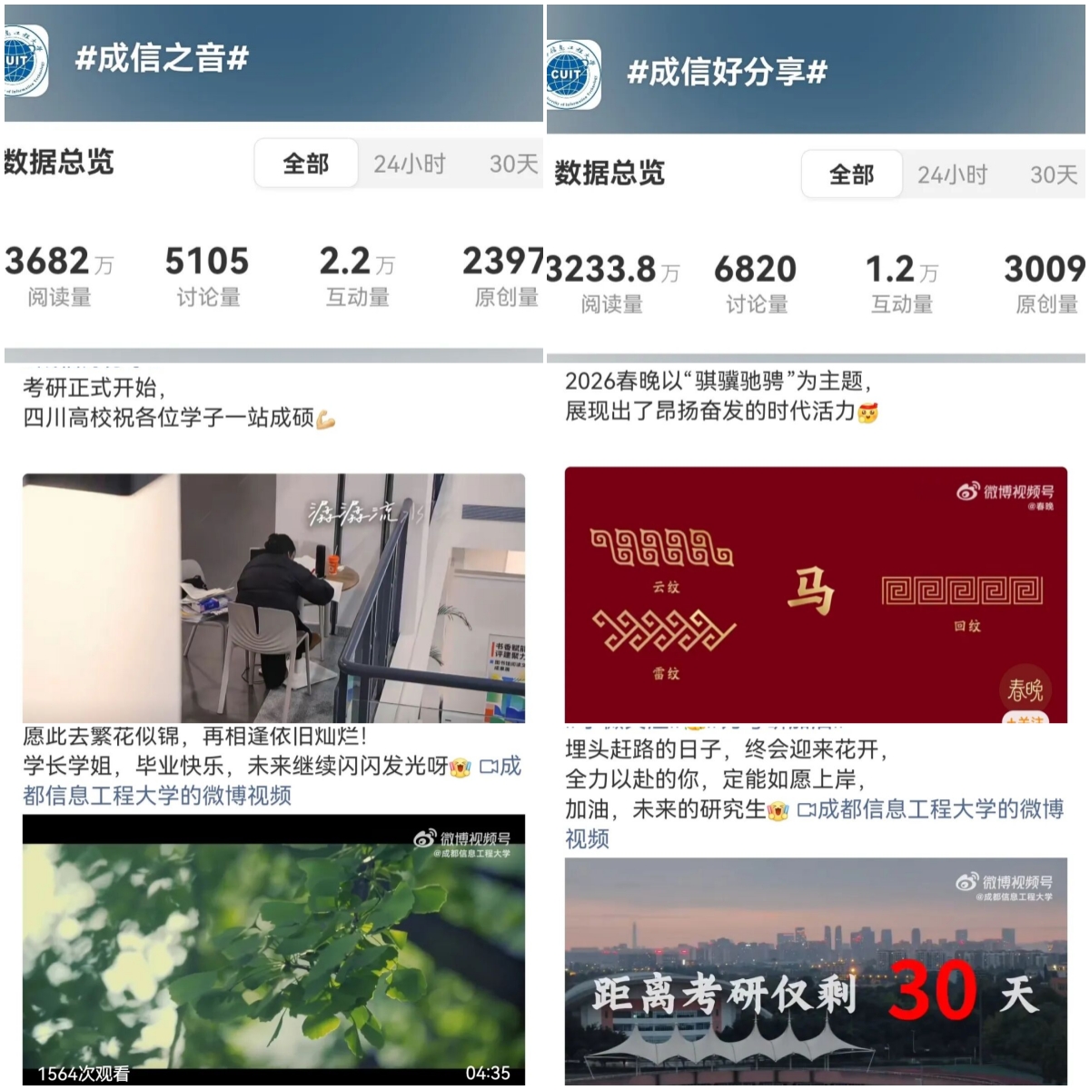 持续优化新媒体矩阵建设。官方微信公众号年度发布图文340条,总阅读量达236.9万,围绕考研、主题教育等打造的系列推文反响热烈。官方微博年度发布2680余条,总阅读量突破1287万,系列话题运营有效激活圈层传播。官方抖音号发布视频42条,获赞超2.9万,以生动影像传递校园温度。官方B站账号发布视频32条,播放量超5万,精准触达青年学生群体。各平台定位清晰、协同发力,初步形成立体化、分众化传播格局。