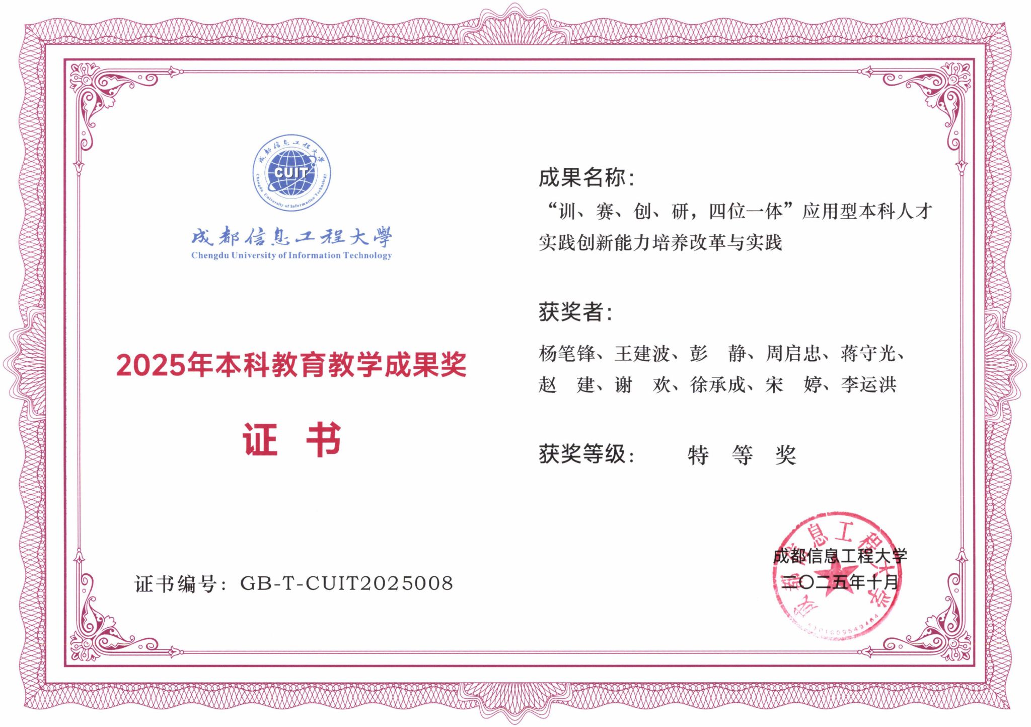 教学改革研究成果斐然,彰显强劲教研活力。2025年,中心获批四川省教改项目1项、校级教改项目5项;斩获校级教学成果奖5项,其中特等奖1项、一等奖2项。尤为突出的是,“训、赛、创、研四位一体应用型本科人才实践创新能力培养改革与实践”项目,凭借系统的改革设计和显著的育人成效,被推荐申报省级教学成果一等奖,是中心深耕教学改革、聚焦人才培养的集中体现。